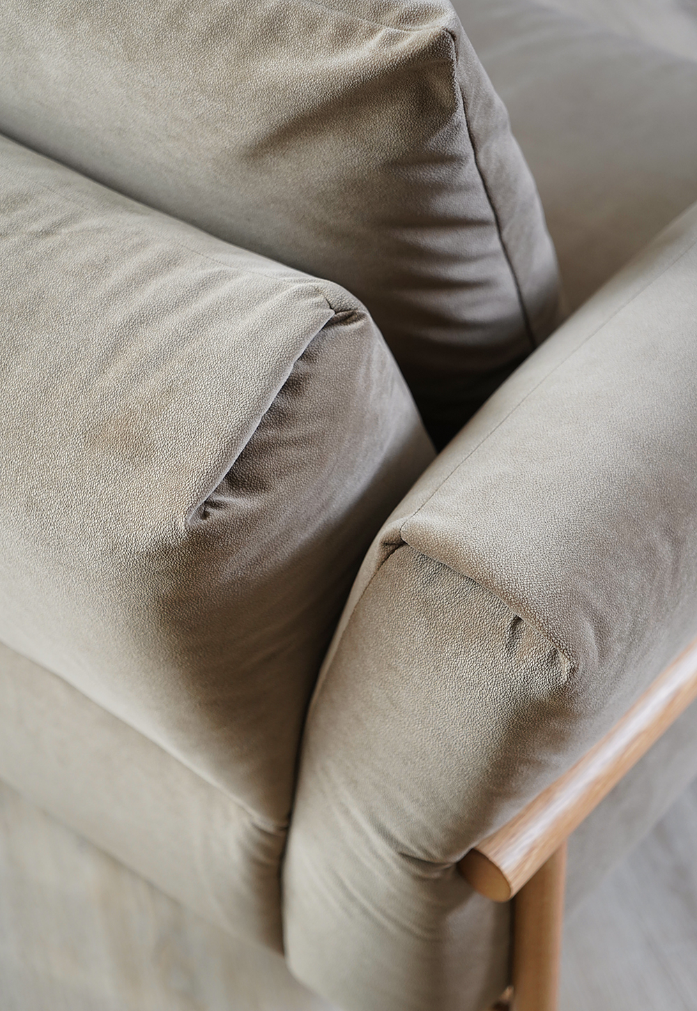 細節部分也能看出設計師的用心。像是布面上的「口袋式摺痕」和順著線條的車縫,都讓沙發多了一點層次感,看起來更自然、更細緻。整體給人的感覺就是:舒服、耐看,又有一點低調的個性。
