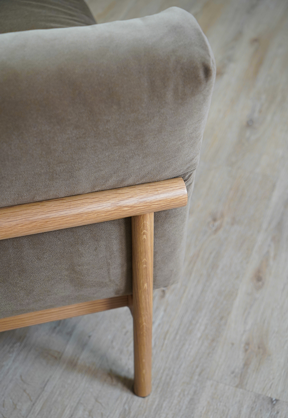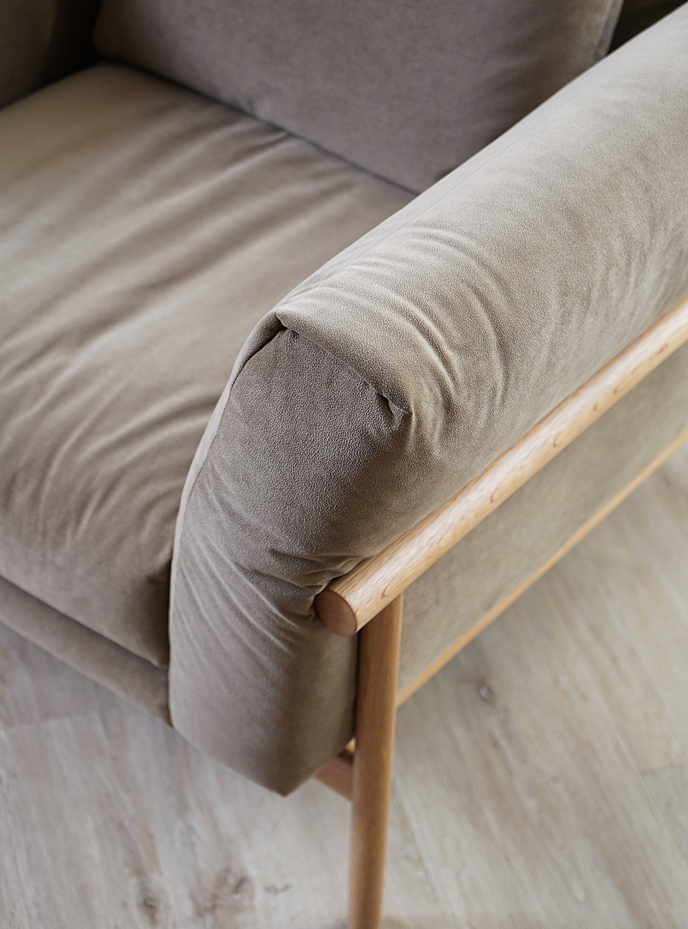 那種感覺不是華麗的高調,而是安靜、有氣質的那種好看。最特別的是它的扶手,布料像是自然地搭在木頭上,柔軟跟堅實在這裡剛好融合在一起。