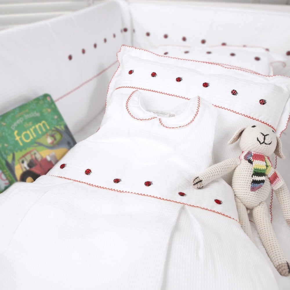 這款瓢蟲系列睡衣包在一切的面料上都採用了100%的純棉襯,採用耐水的polyester布料來協助寶寶的突發狀況,圓弧的下擺處是一個拉鍊開口,可以保護好寶寶的小腳丫。