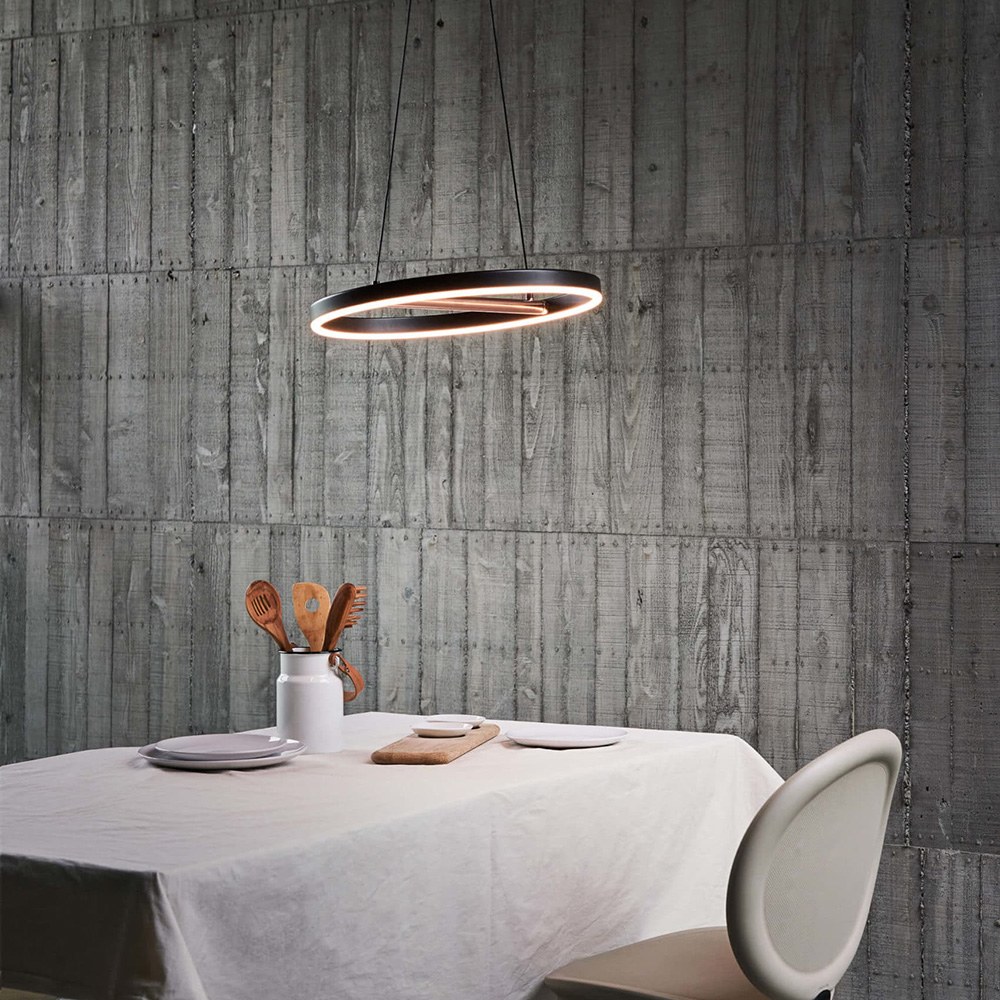 以「日恆」為名,沿著天體繞行劃留出炫目的環形光軌,橫渡其中的金屬電鍍平衡桿,象徵著區分白天夜晚的時光交接。高掛半空的SOL 一如星系中的行星翻轉,以恆星為中心自由調整傾斜角度,大大小小的燈體錯綜排列,倏忽想起星象圖浩瀚無際的未知感受。