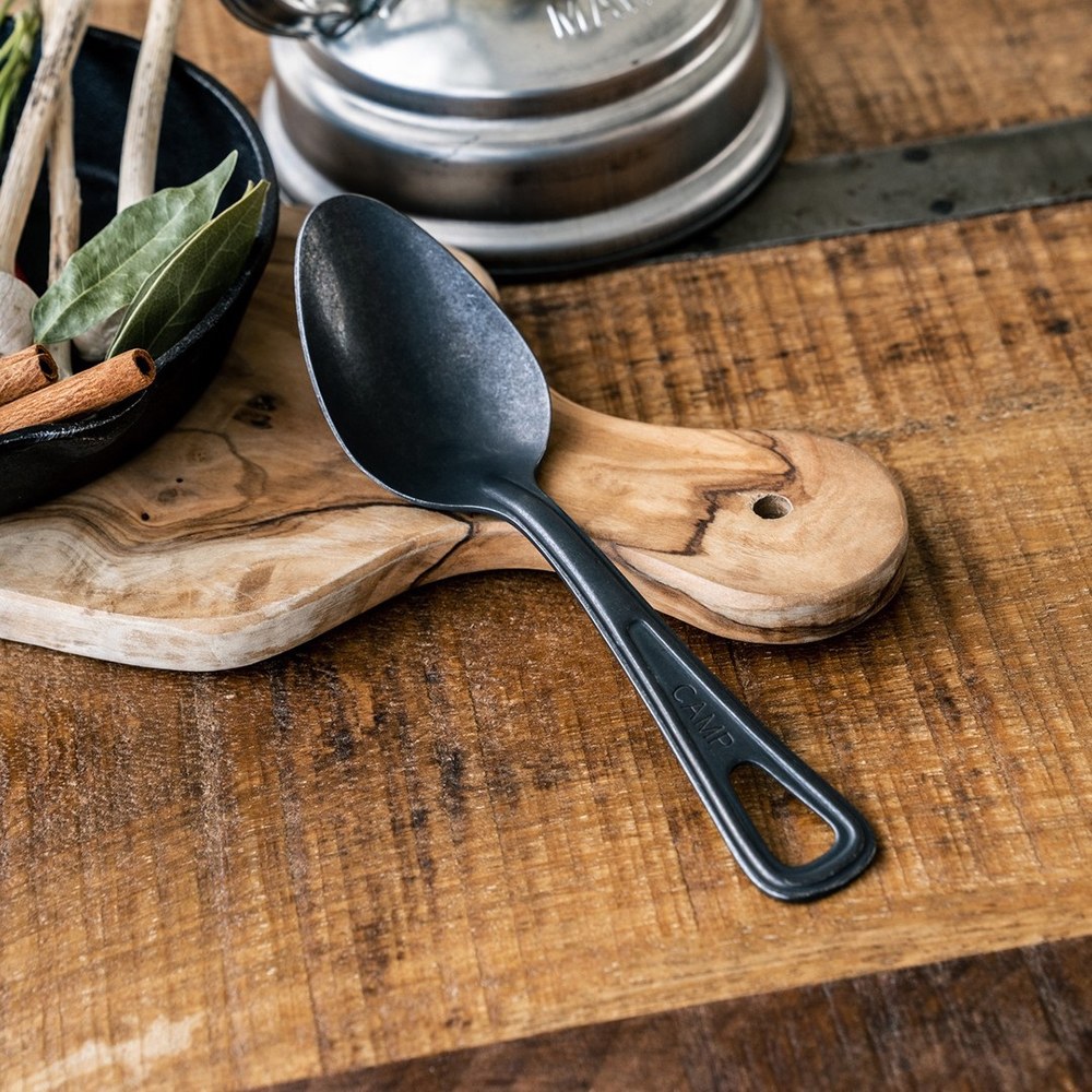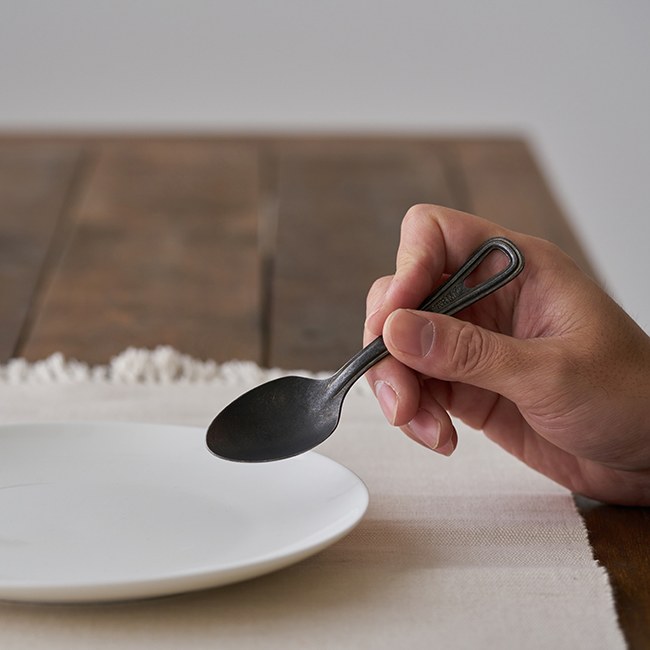 野營風餐具系列,黑色的金屬餐器帶著粗曠的成熟魅力,無論室內或戶外使用都別具風格,在握柄處有著挖洞設計,可以搭配扣環使用,或是掛在掛鉤上收納。簡歛的風格中帶著工匠的技藝精神,以純熟技術創造出一系列金屬餐器,無論是喜歡戶外露營、軍用風格、工業風、復古質樸風,都很適合搭配使用。