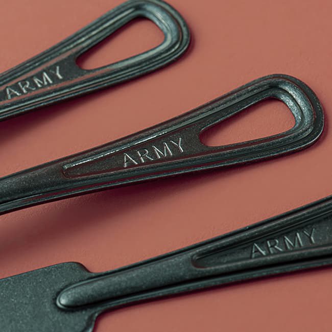 以18-8不鏽鋼打造,以復古的美式軍用風格設計,可以配合各式餐具、餐桌風格、及飲食習慣使用。