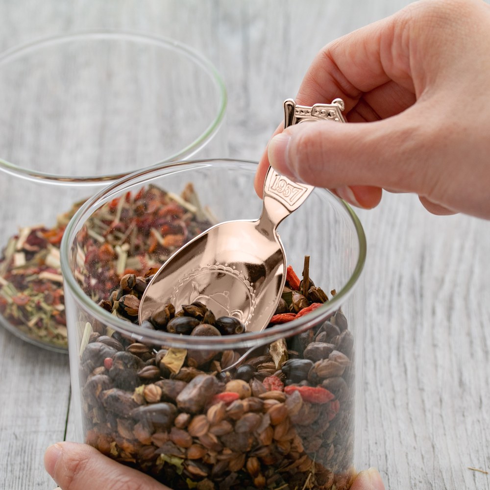 以不鏽鋼打造粉金色系茶器,給茶葉專屬的使用器具,讓品茗時光更加香氣四溢,更富有高雅風尚感。