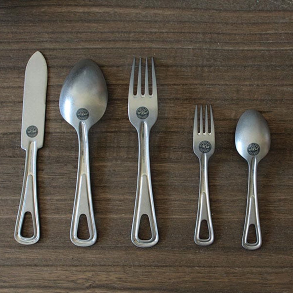 野營風餐具系列,銀色的金屬餐器帶著軍風露營的職人靈魂,無論室內或戶外使用都別具風格,在握柄處有著挖洞設計,可以搭配扣環使用,或是掛在掛鉤上收納。簡歛的風格中帶著工匠的技藝精神,以純熟技術創造出一系列金屬餐器,無論是喜歡戶外露營、軍用風格、工業風、復古質樸風,都很適合搭配使用。