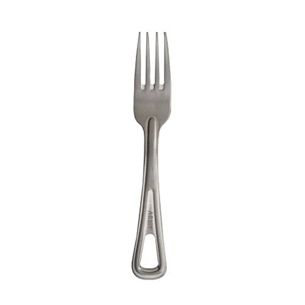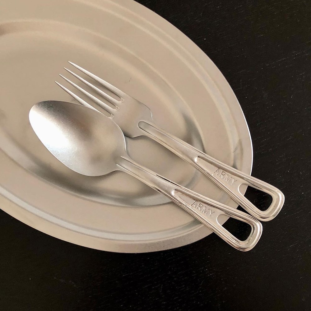 野營風餐具系列,銀色的金屬餐器帶著軍風露營的職人靈魂,無論室內或戶外使用都別具風格,在握柄處有著挖洞設計,可以搭配扣環使用,或是掛在掛鉤上收納。簡歛的風格中帶著工匠的技藝精神,以純熟技術創造出一系列金屬餐器,無論是喜歡戶外露營、軍用風格、工業風、復古質樸風,都很適合搭配使用。