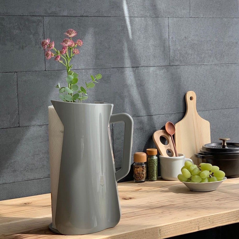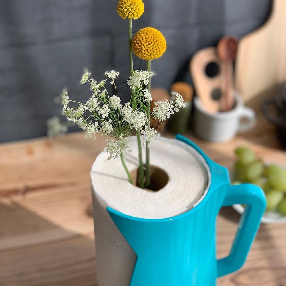 可以享受藝術感的新型廚房紙巾架。乍看像一個簡單而時尚的水壺,其實是廚房紙巾架,並結合了紙巾架和花瓶, 是一石三鳥的設計。紙巾架軸芯附有一個塑膠花座可以取出裝水,能夠真正地裝飾和欣賞鮮花,營造華麗空間。切割廚房紙巾時把手易於抓握,移動物品時也相當便利。