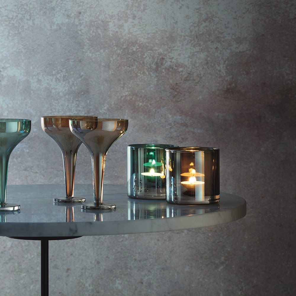 爵士時代炫彩燭台有著舞伶般的魅力,內裡是優雅的色系,外層則是金屬感的炫彩感,在不同角度、光線裡釋放著不同的語彙,無論是簡單點上小顆蠟燭,或展示小巧的花朵在其中,都如同舞者們生動的姿態嶄露在亮麗的舞台之上,讓空間中的氣氛也隨之生動。