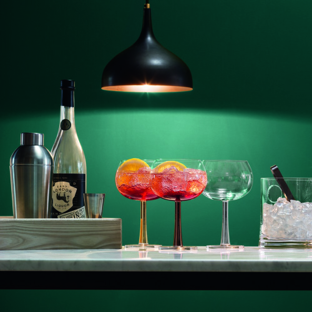 雞尾酒派對球型高腳杯,在經典的圓球形調酒杯上做了一些叛逆的小改變,較粗的杯腳上鋪上金屬色的釉漆,無論在居家空間擺放,或想在露台享受一點陽光美酒的樂趣都可以帶上它,不僅大方亮眼,還相當有個性!週末假期可以在自家陽台用自己喜好的利口酒與調酒工具們,把酒杯盛裝色彩繽紛的輕調性雞尾酒或是特調酒品,享受微醺時光。