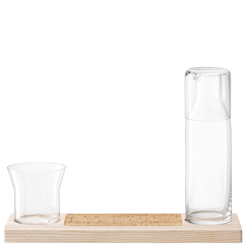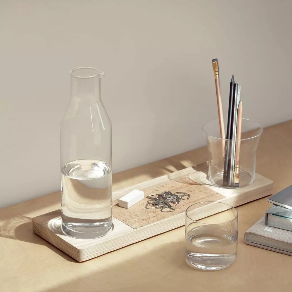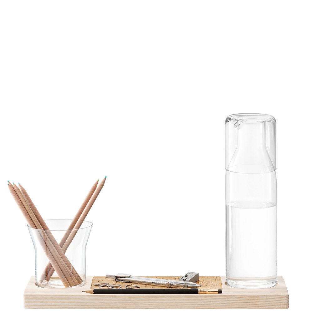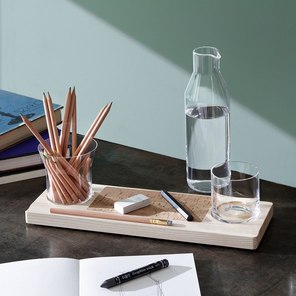 桌上型文具水壺二入組,口吹玻璃壺位於托盤內,沿邊緣的窄槽專為鋼筆和鉛筆設計,而平坦的軟木平面則可放置電話、文具、鑰匙或其他個人物品提供了意想像不到的空間設計。