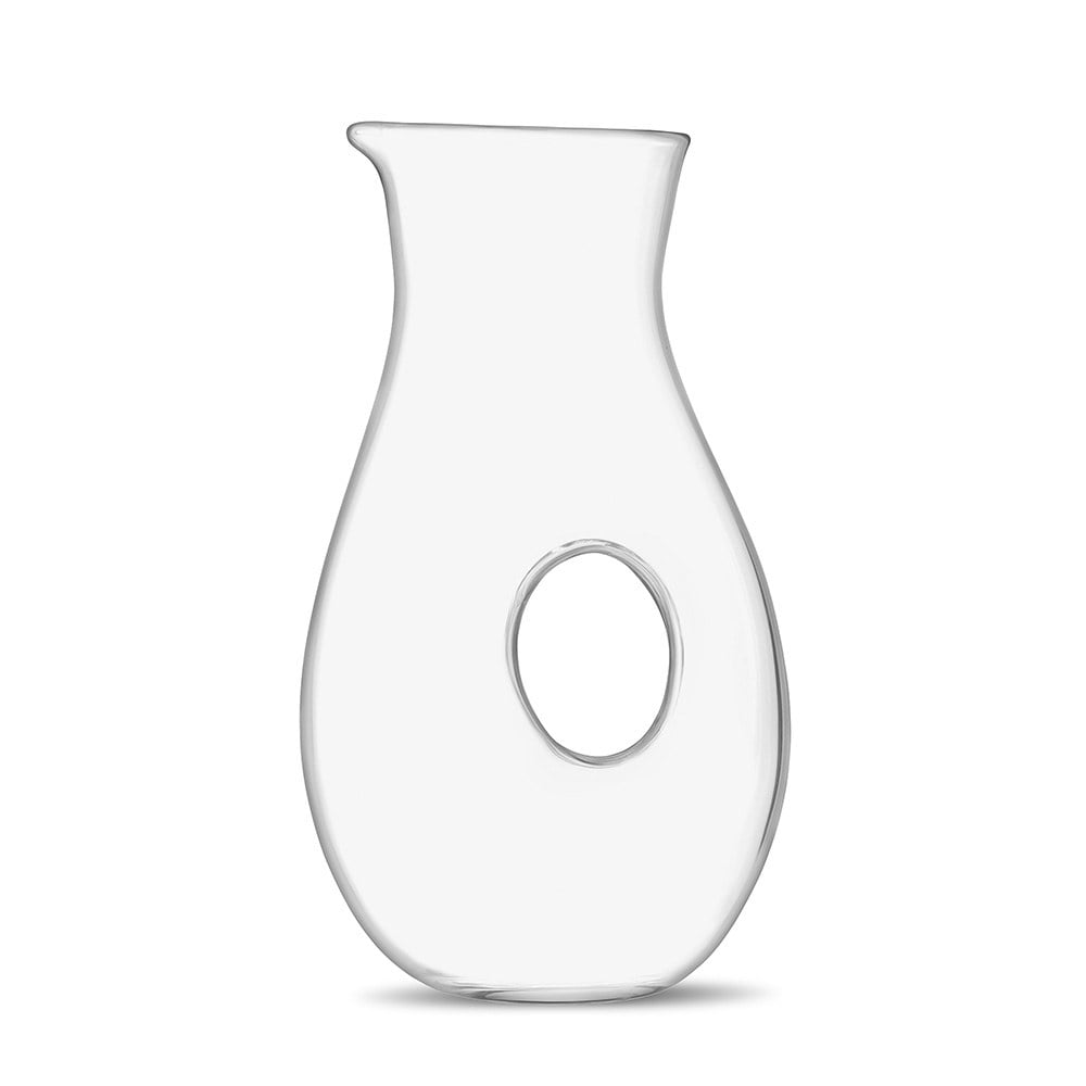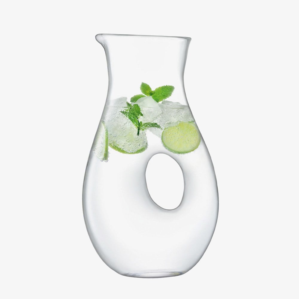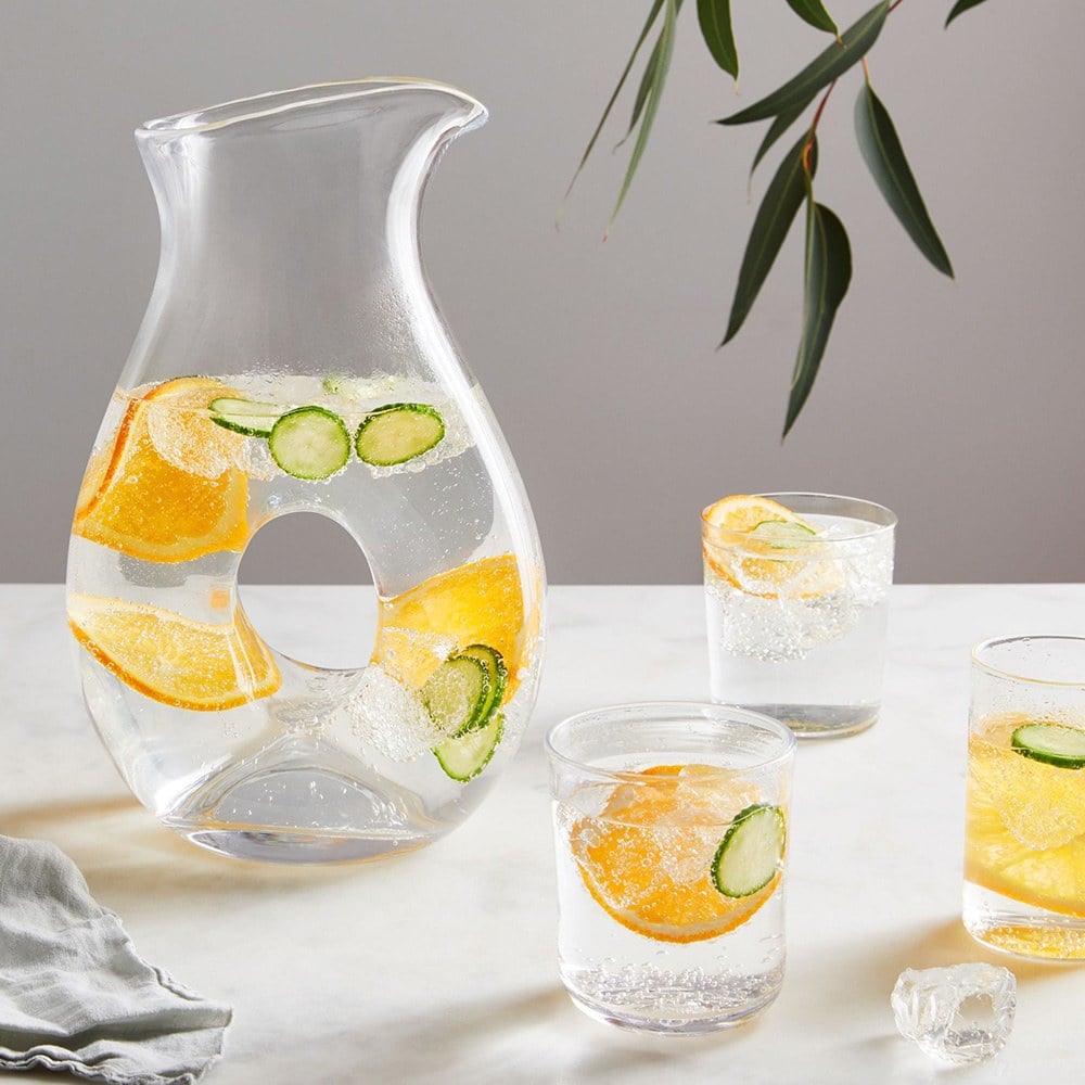 手工熔口玻璃自然形水壺,極透光清晰,造型看起來簡單清爽,是不一樣的牛奶壺造型,在瓶口處做了微微的皺褶,恰好可以稍稍擋住壺中的檸檬片或是薄荷葉,讓飲料可以順利流出。