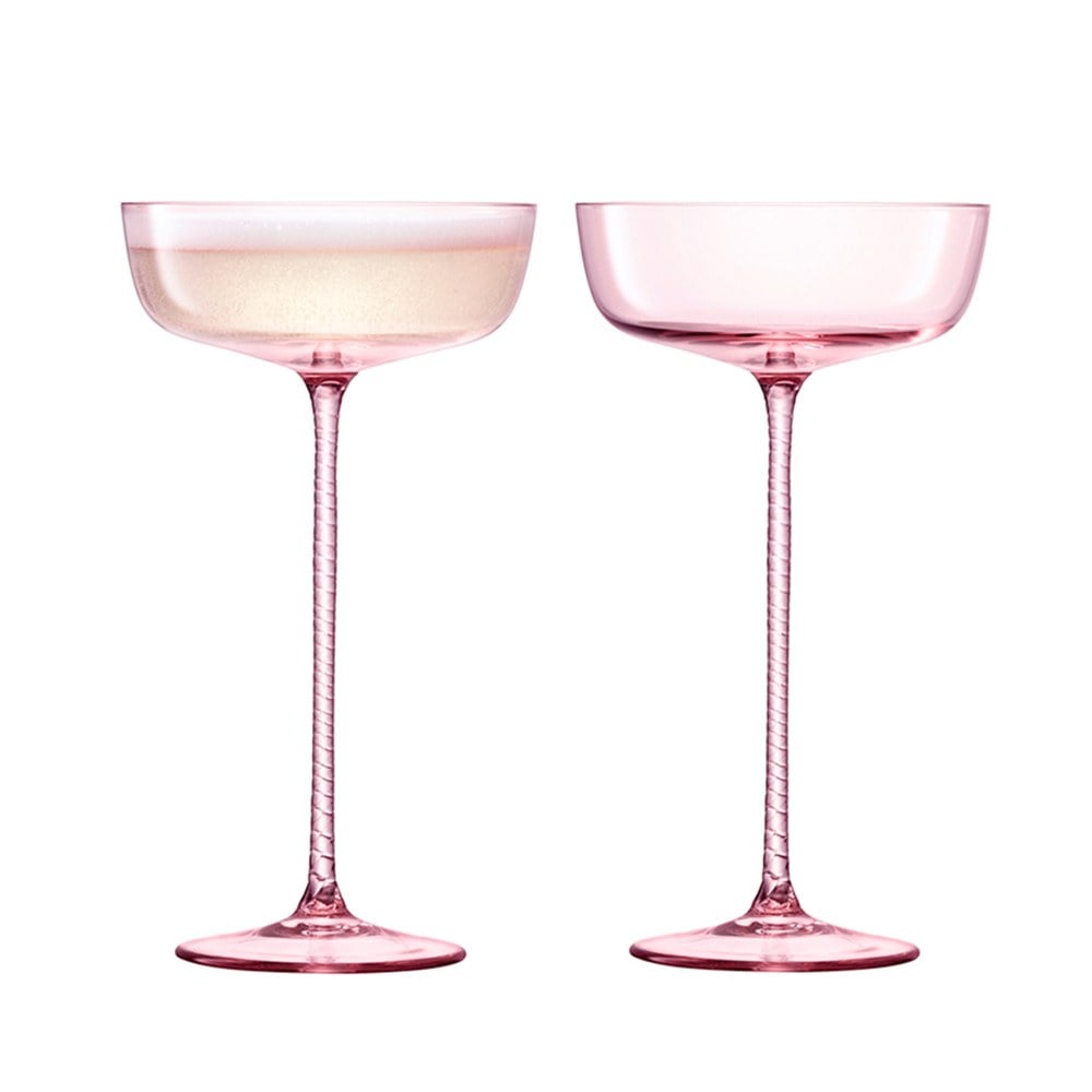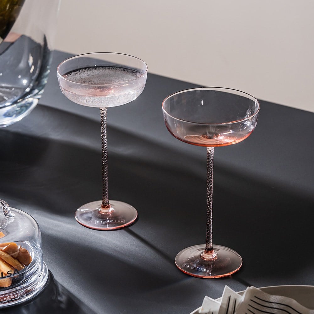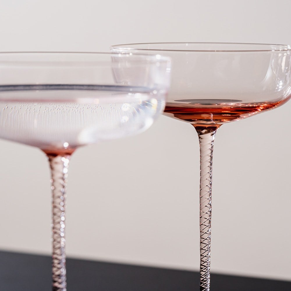 螺旋紋香檳杯2入組,杯柄上有復雜的扭曲細節,是展現玻璃頂級工藝技法,全靠老經驗玻璃師傅眼睛把關,手工繪製,需要工藝品等級的細心呵護。精工的細節讓承裝的飲品格外浪漫有情調。