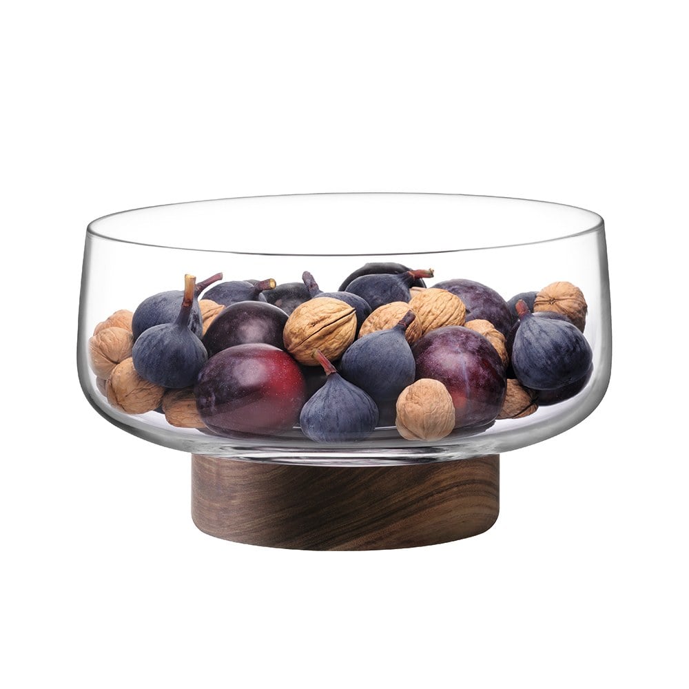 榛果木玻璃碗,厚重的底部設計可穩穩地放置在圓柱形的胡桃木底座內。這是一款現代感十足的上菜器皿,適合用於沙拉、甜點或水果的盛裝。使用FSC認證的胡桃木色料。