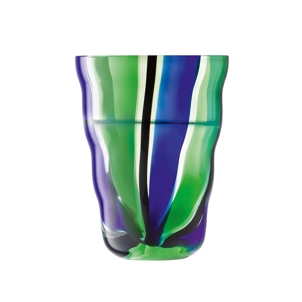 Folk豔彩條紋水杯2入組,使用彩色玻璃吹製讓玻璃條紋膨脹,形成具有獨特圖案的有機形狀,每個器皿都是獨一無二的,絕不會有兩個相同的作品,擁有獨特的民俗風格圖案和起伏的形狀。