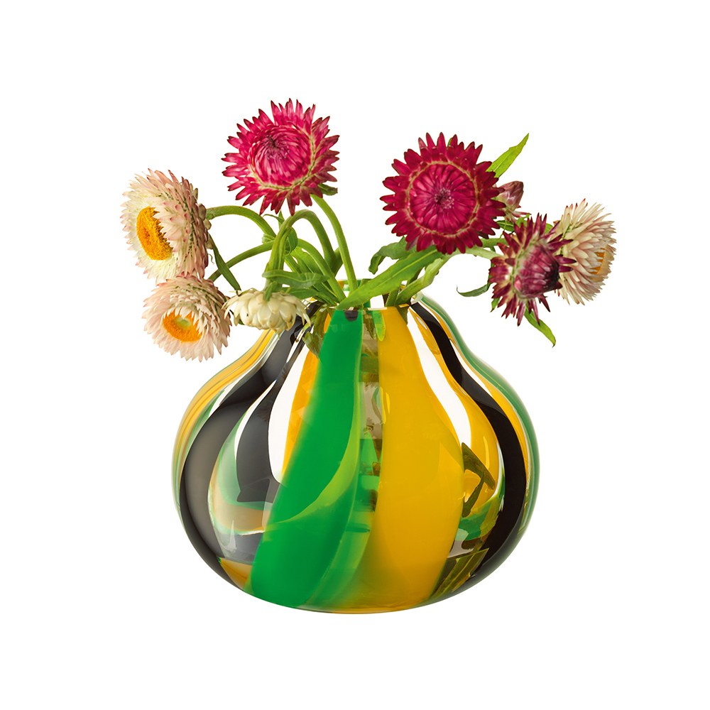 Folk豔彩條紋花瓶,擁有獨特的民俗風格圖案和圓潤的造型。非常適合用於單枝花卉、小型花束或桌面中央裝飾。