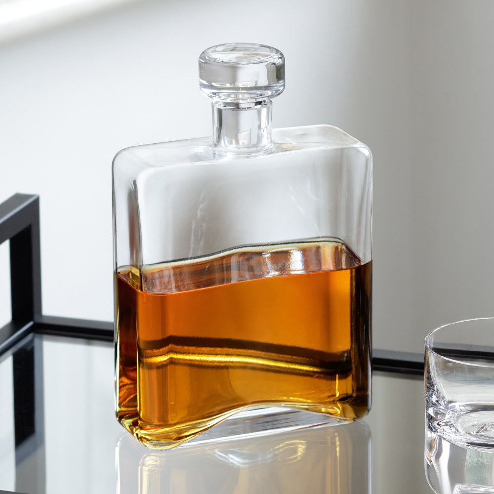 Cask長方形威士忌醒酒器由技藝精湛的工匠手工吹製,呈現出現代感的直線側形及長方形扁瓶身,厚重的圓柱形玻璃瓶塞經手工研磨,確保完美契合。
