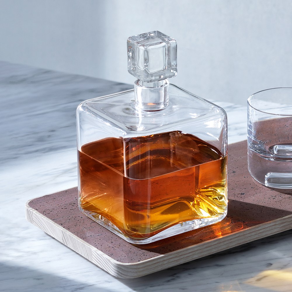 Cask方塊威士忌醒酒器由技藝精湛的工匠手工吹製,呈現現代感的直線輪廓,立方體造型。厚重的玻璃瓶塞與瓶身相呼應,並經手工研磨以確保完美貼合。