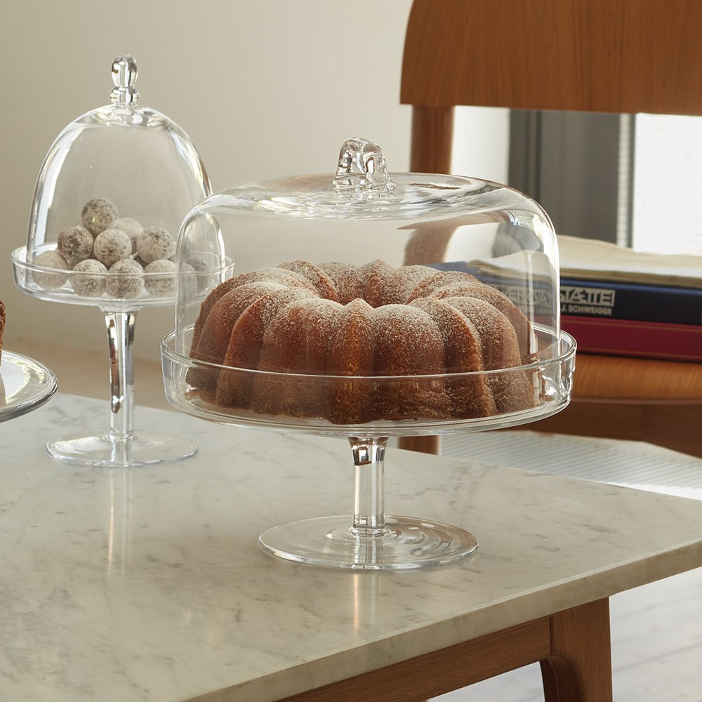 晶透玻璃派對點心盅,配有寬邊托盤、厚實支柱和穩固的玻璃底座。頂部搭配帶有精緻手柄的大型玻璃罩,適用於擺放大型蛋糕、單個蛋糕或一疊英式鬆餅。