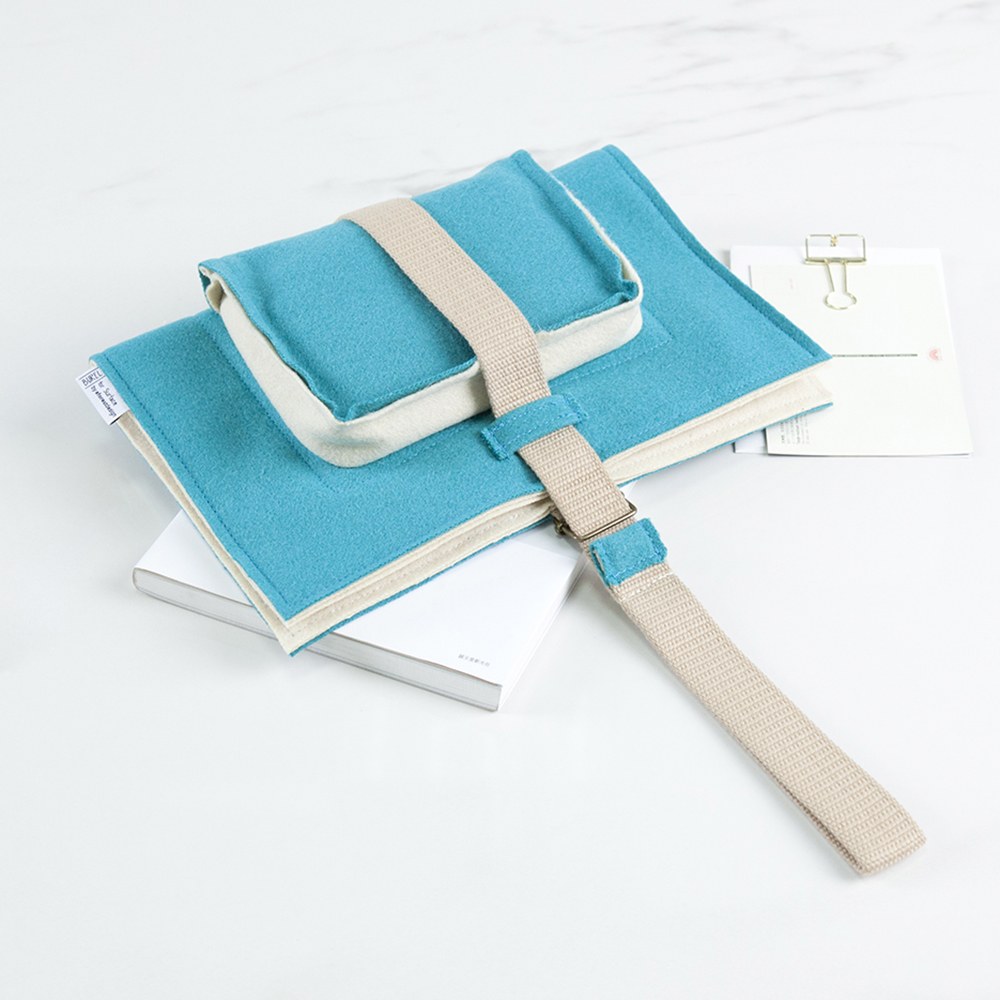 這款水藍的提袋款平板保護包外側有編織布帶可以固定,也能作為提把方便攜帶。