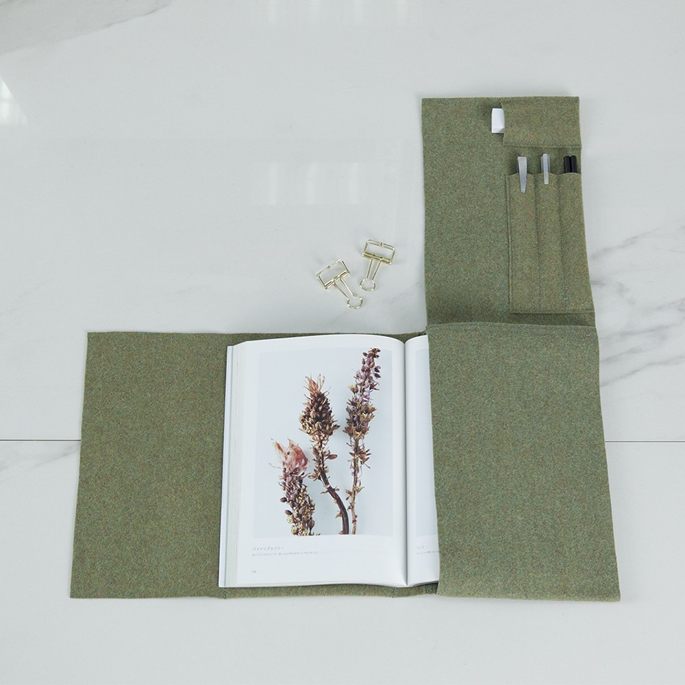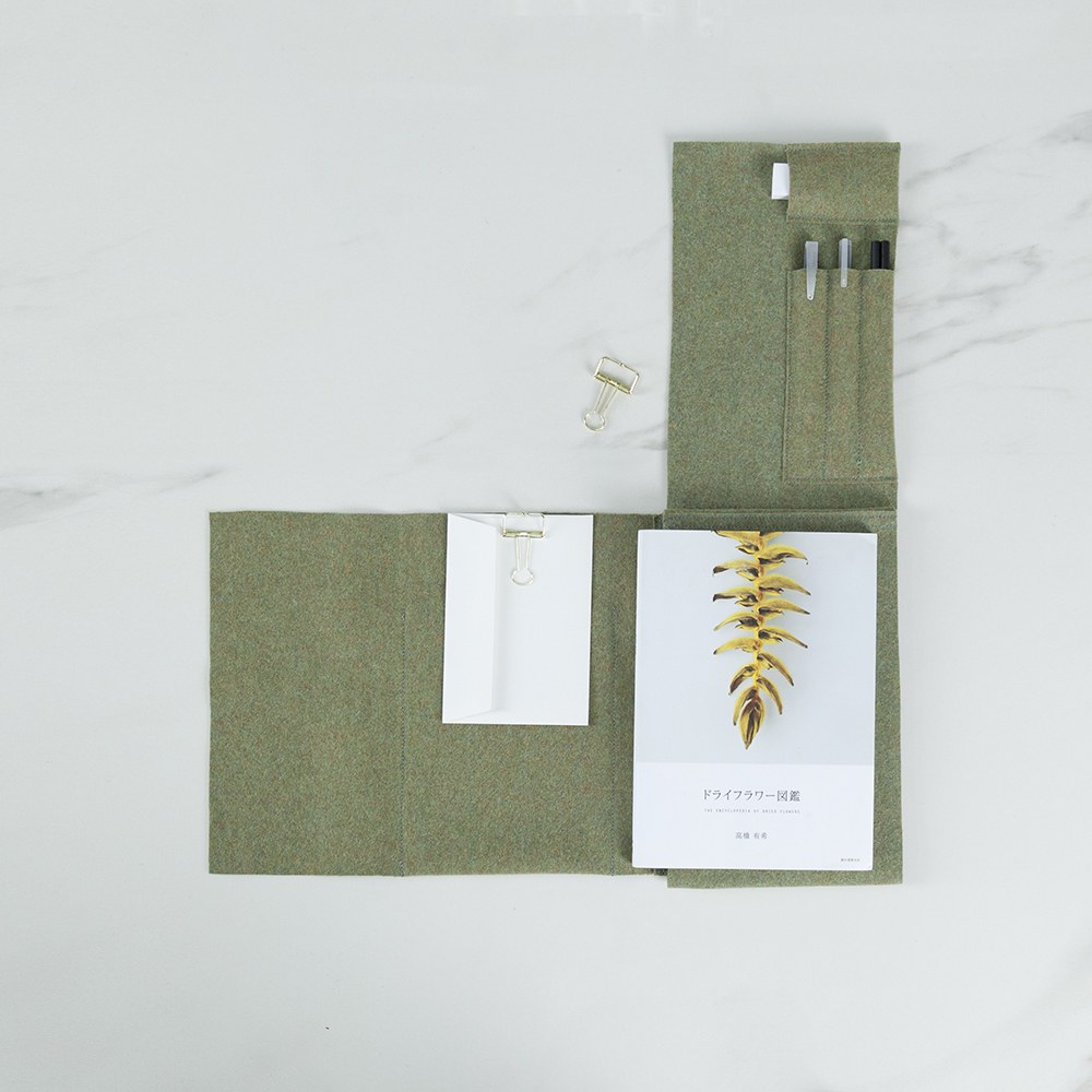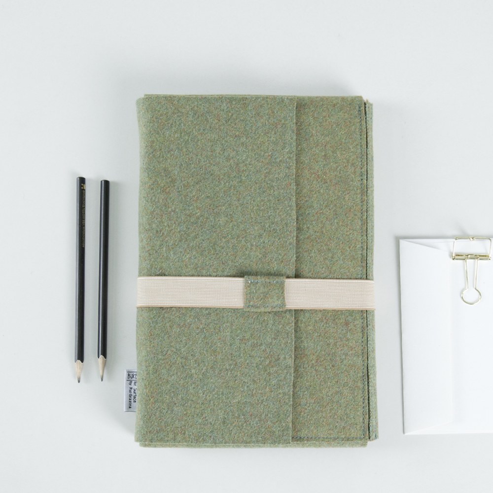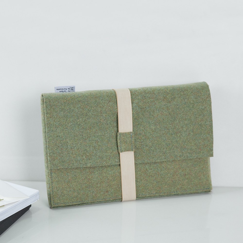 這款綠色的筆記本款平板保護包,設計了縱向捆帶可以固定,造型上像帶有書卷味的綁帶筆記本。
