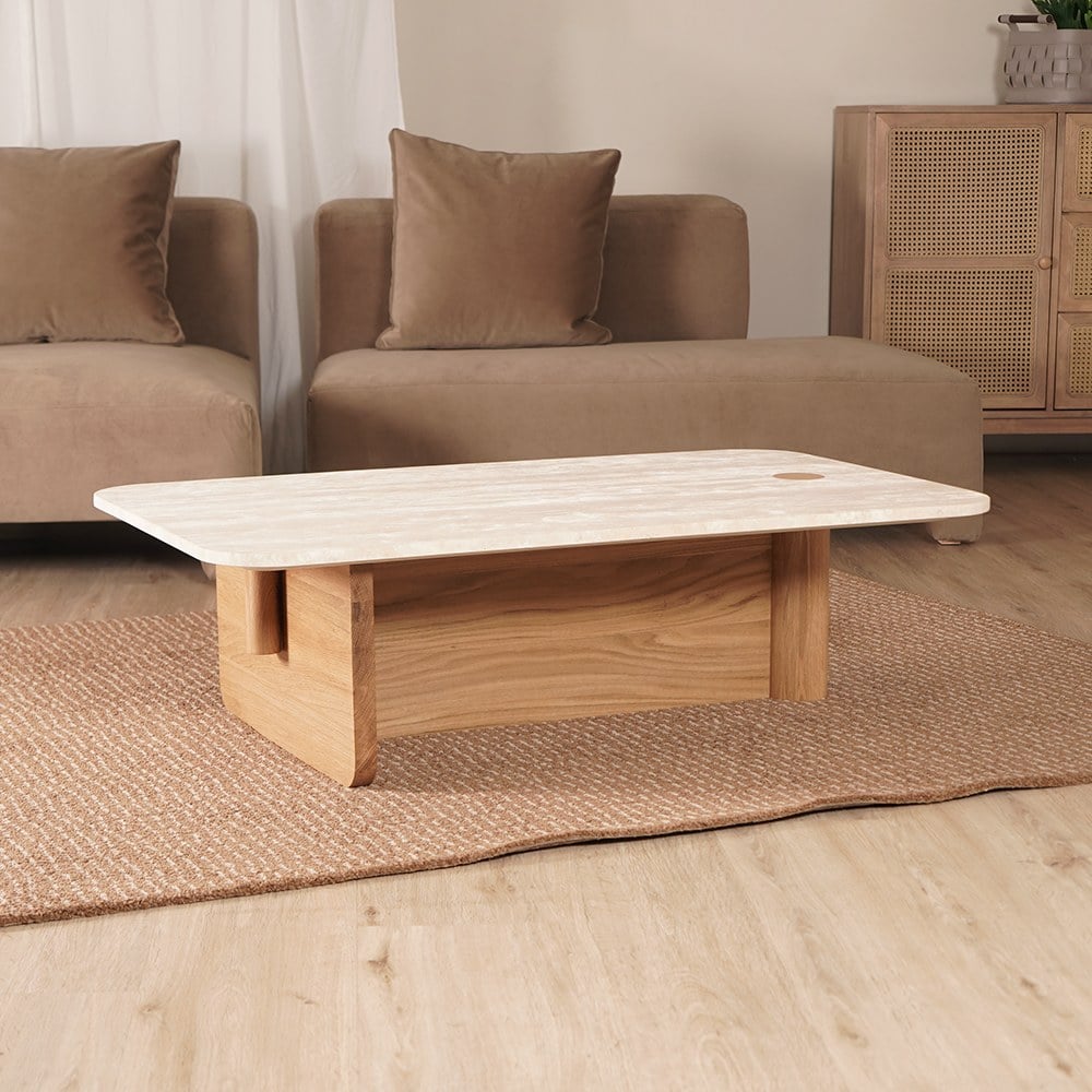 丹麥 Natadora Pivot T字洞石茶几的設計特色在於一根實木圓柱貫穿與 T 字結構相接,圓潤與平面之間的對比為整體造型增添層次。這根圓柱延伸至桌面。桌尾則以半截木質圓柱呼應主要的圓柱形桌腳,達成視覺上的平衡與呼應。