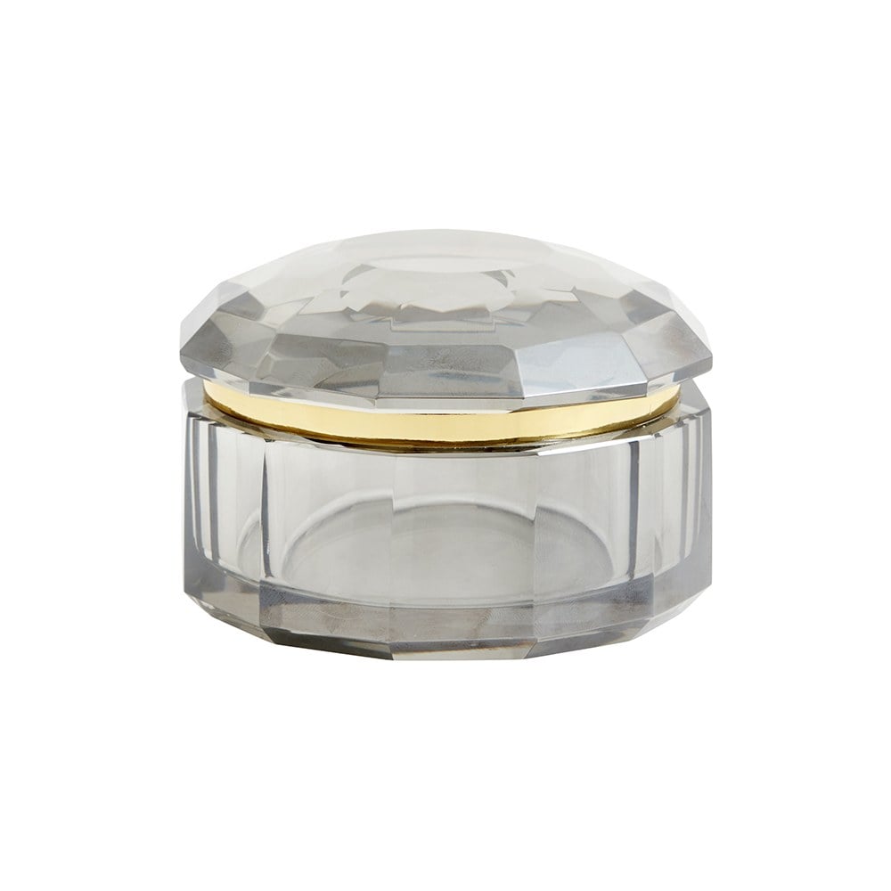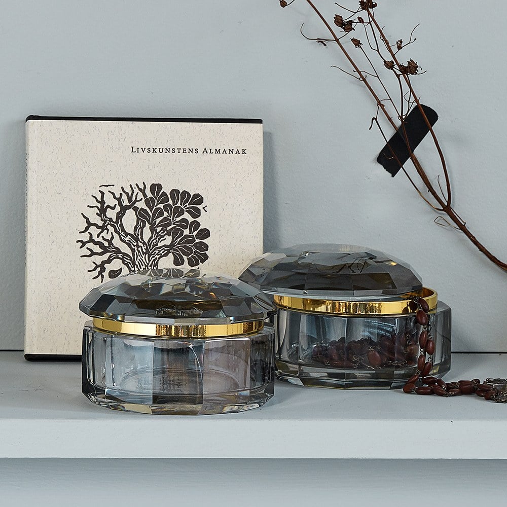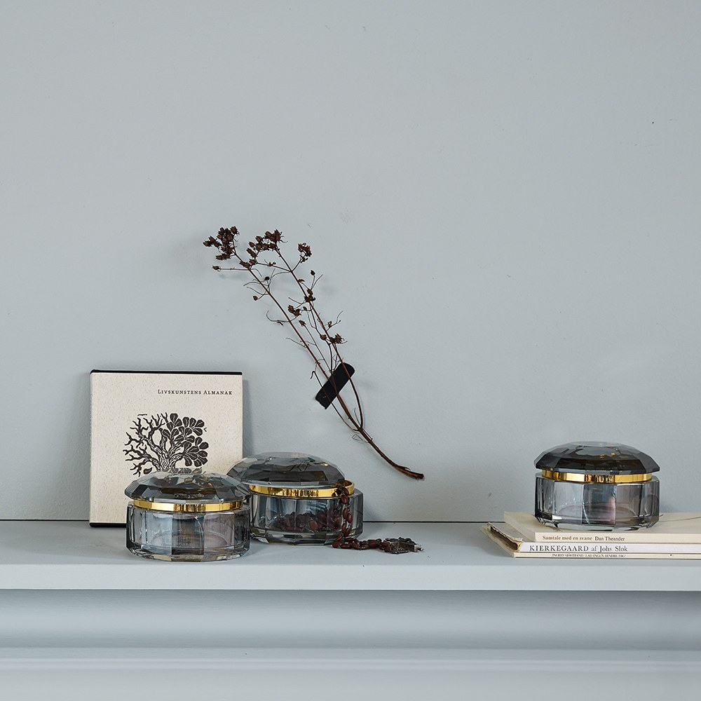 用水晶玻璃製作而成的收納盒,內斂典雅的煙灰色澤與水晶玻璃切割成一個穹頂寶蓋的形狀,在光線之下隱隱約約可見閃爍的霓虹,像是一個聚寶的福袋可以在其內擺放錢母銅板,或是當作首飾的收納盒,不論是臥室或是客廳、玄關都非常的精緻實用。