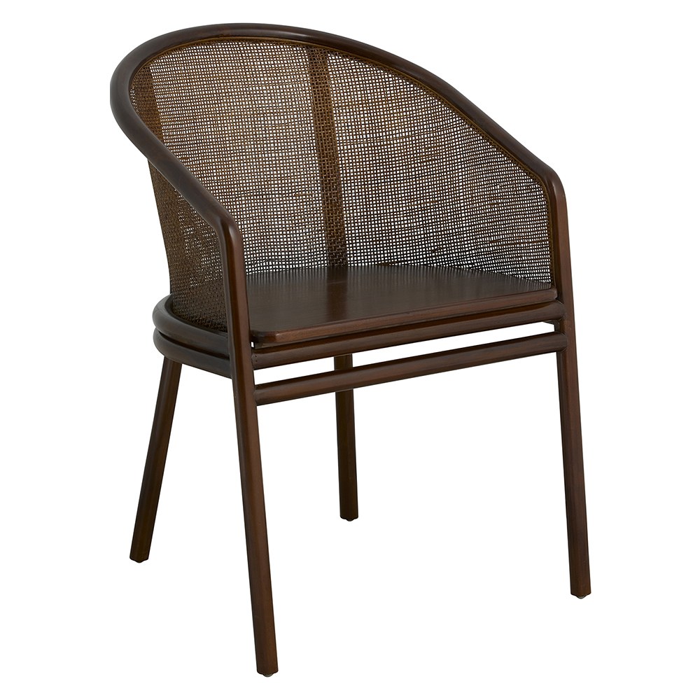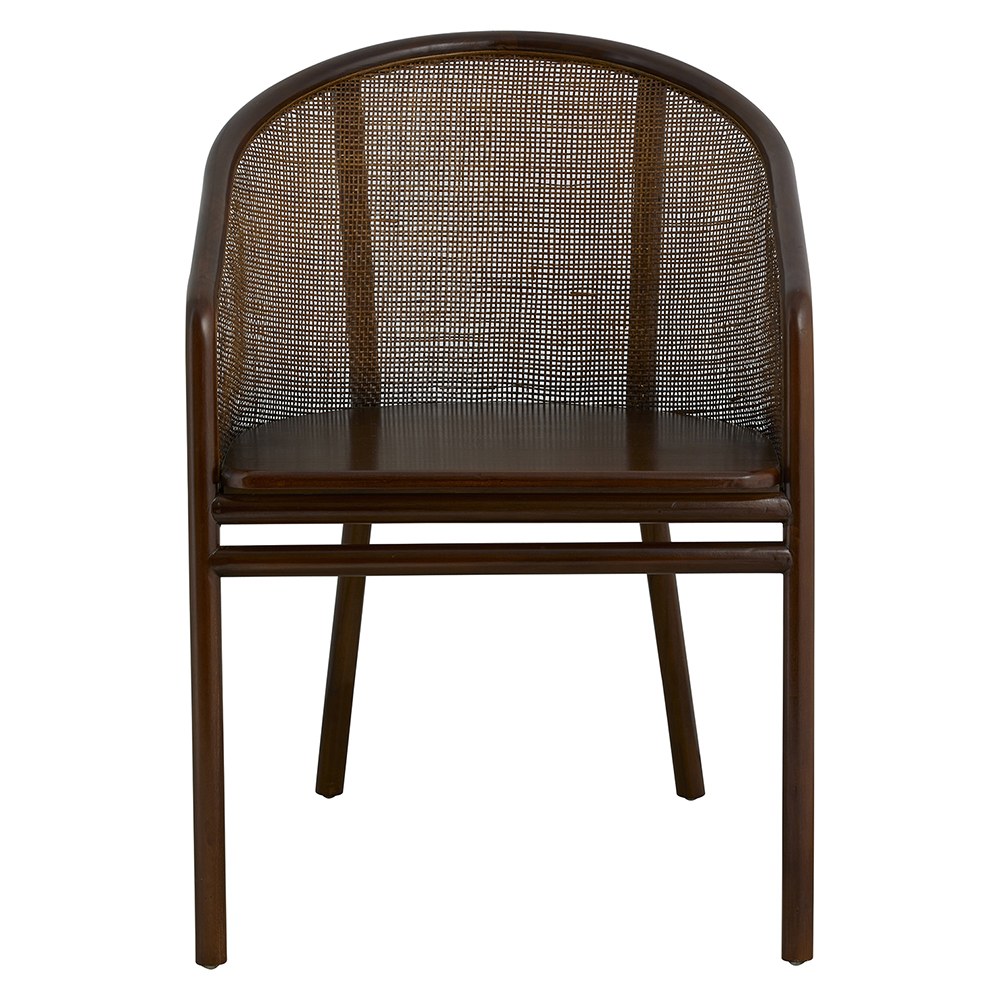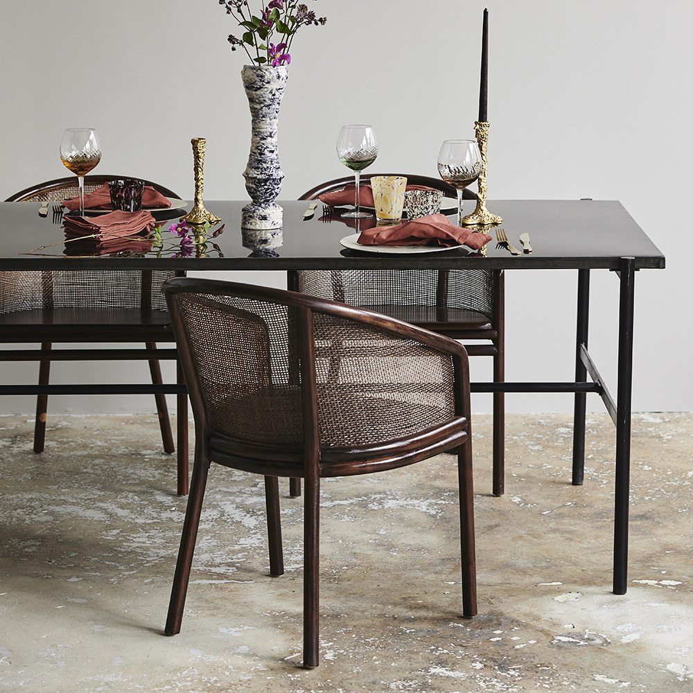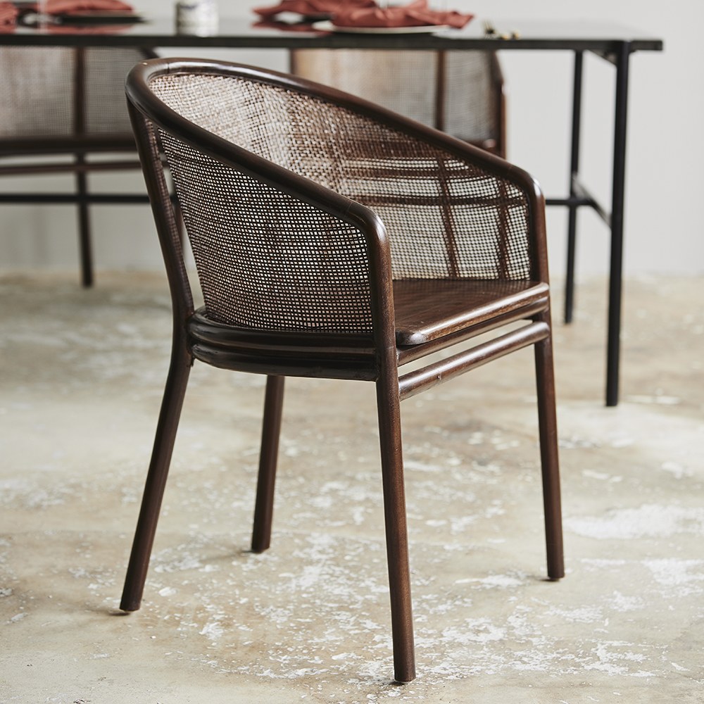 以細格藤編織包覆的柚木單椅,細膩了藤編椅的想像,純色柚木單椅讓餐桌多了一份沙龍時髦。