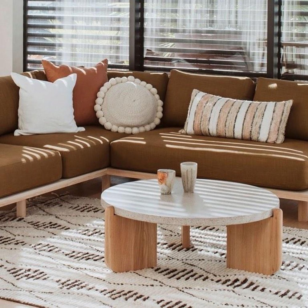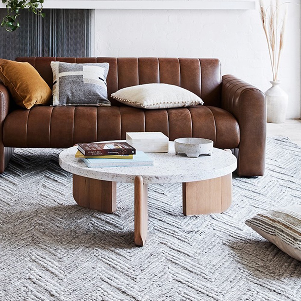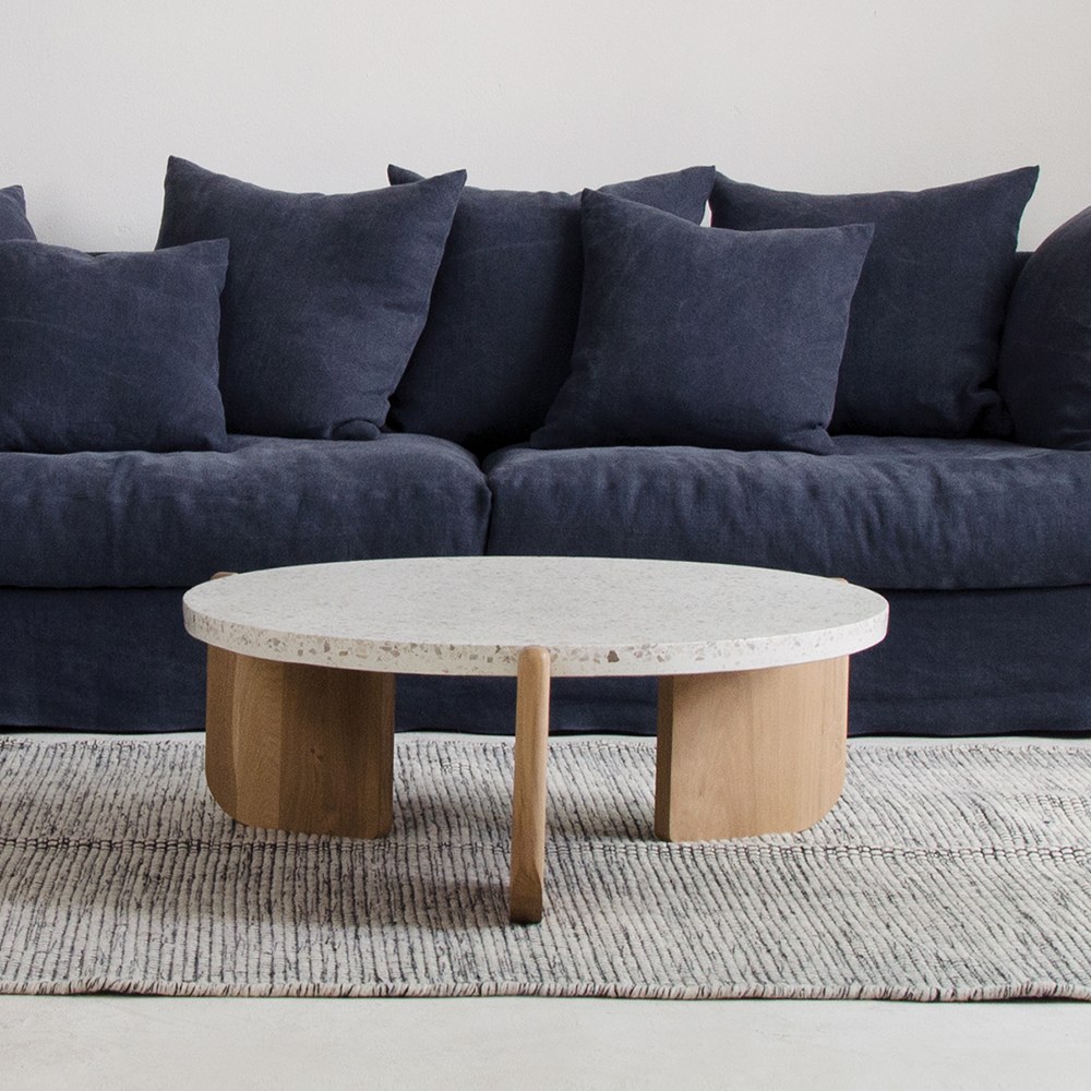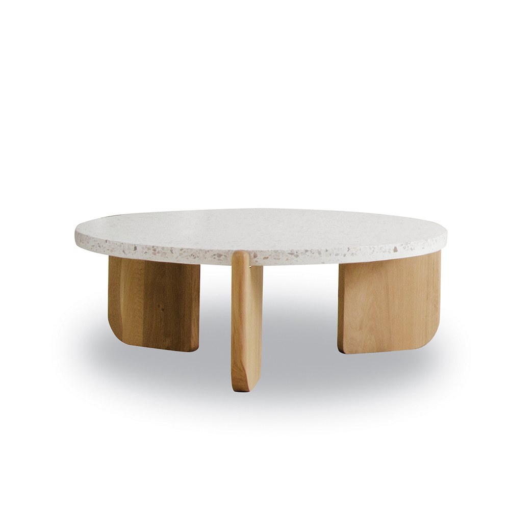 水磨石的質感與紋理有一種貼近生活的親切感,又不失優雅氣度,沒有大理石流水般花俏的石紋,卻擁有鄉間小徑中的自然溫潤,好像能聽見水珠滴答敲在石子路上的聲響,讓這張水磨石面圓形茶几可以為一杯午茶的時間帶來完全不同的質感與情緻。