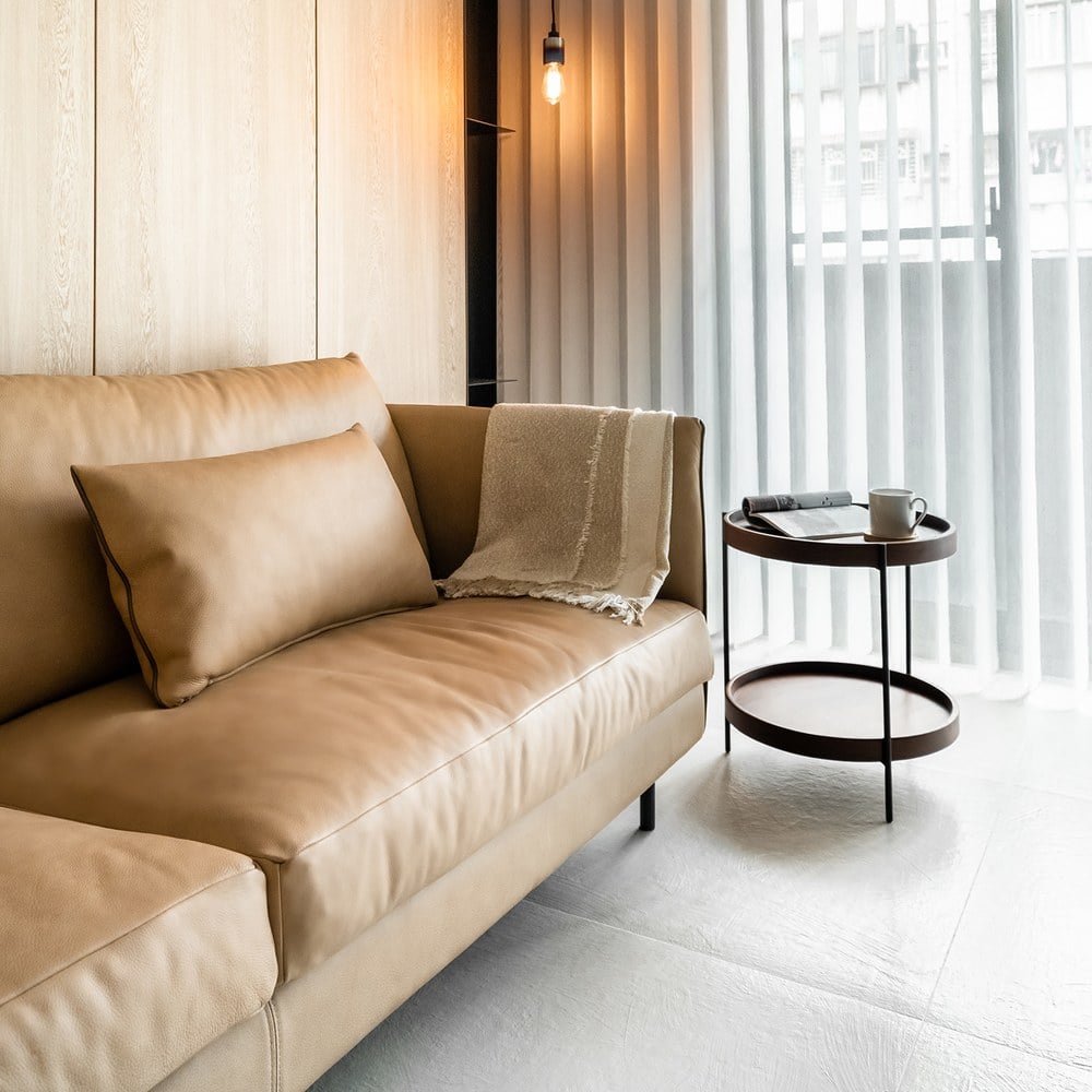 全新Weekend北歐假日皮革沙發─奶茶色!穠纖合度扶手設計,格外薄,輕盈又俐落。