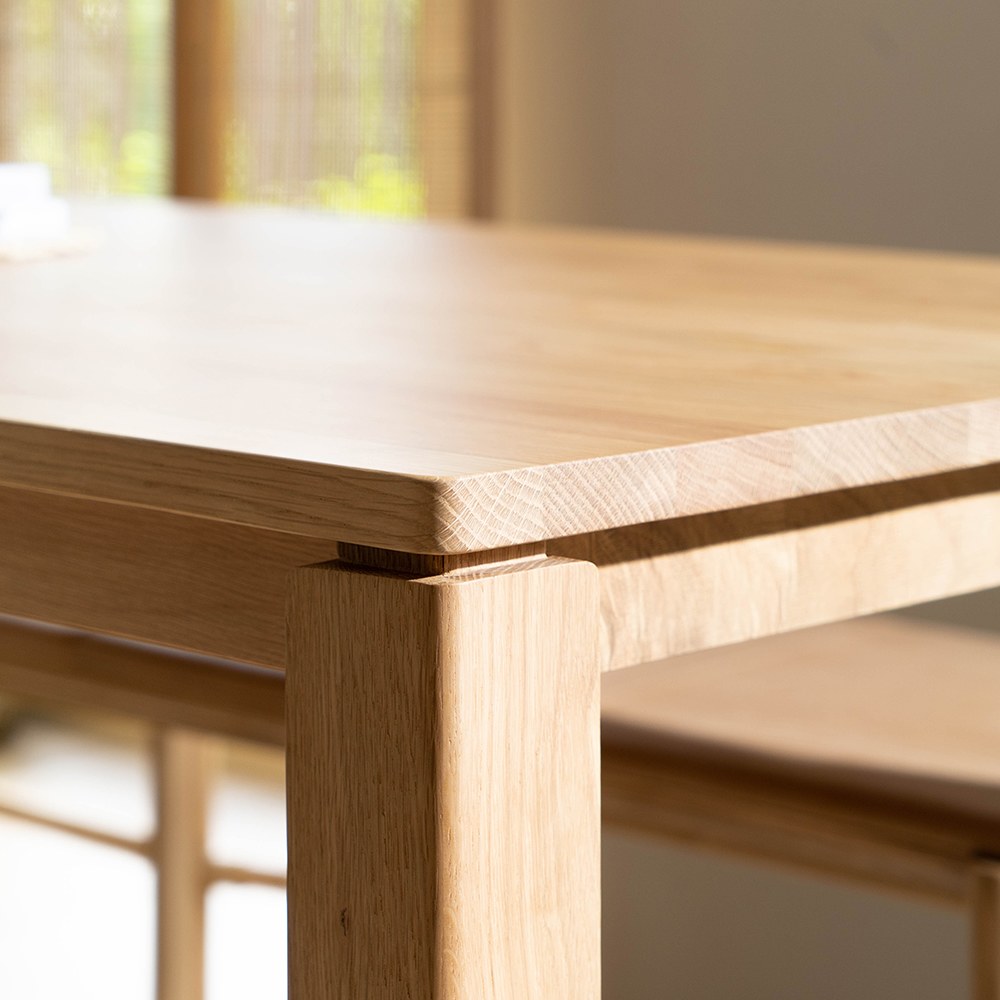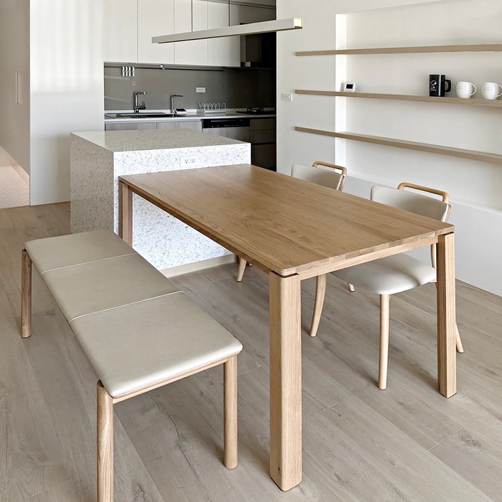 嚴選北美FSC天然白橡木,有著密度大、堅硬沉重、彎曲性佳的特點,好塑形木材質感佳,製程細膩的木工處理,在意每一個使用者的安全,特別是尺寸從140cm - 220cm讓小空間也有選擇!讓晚餐或工作的同時感受設計者與工匠的用心,也為居家生活創造更多。
