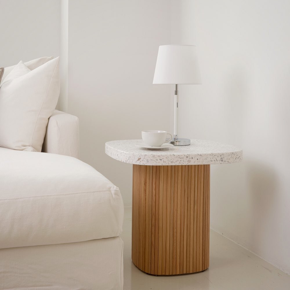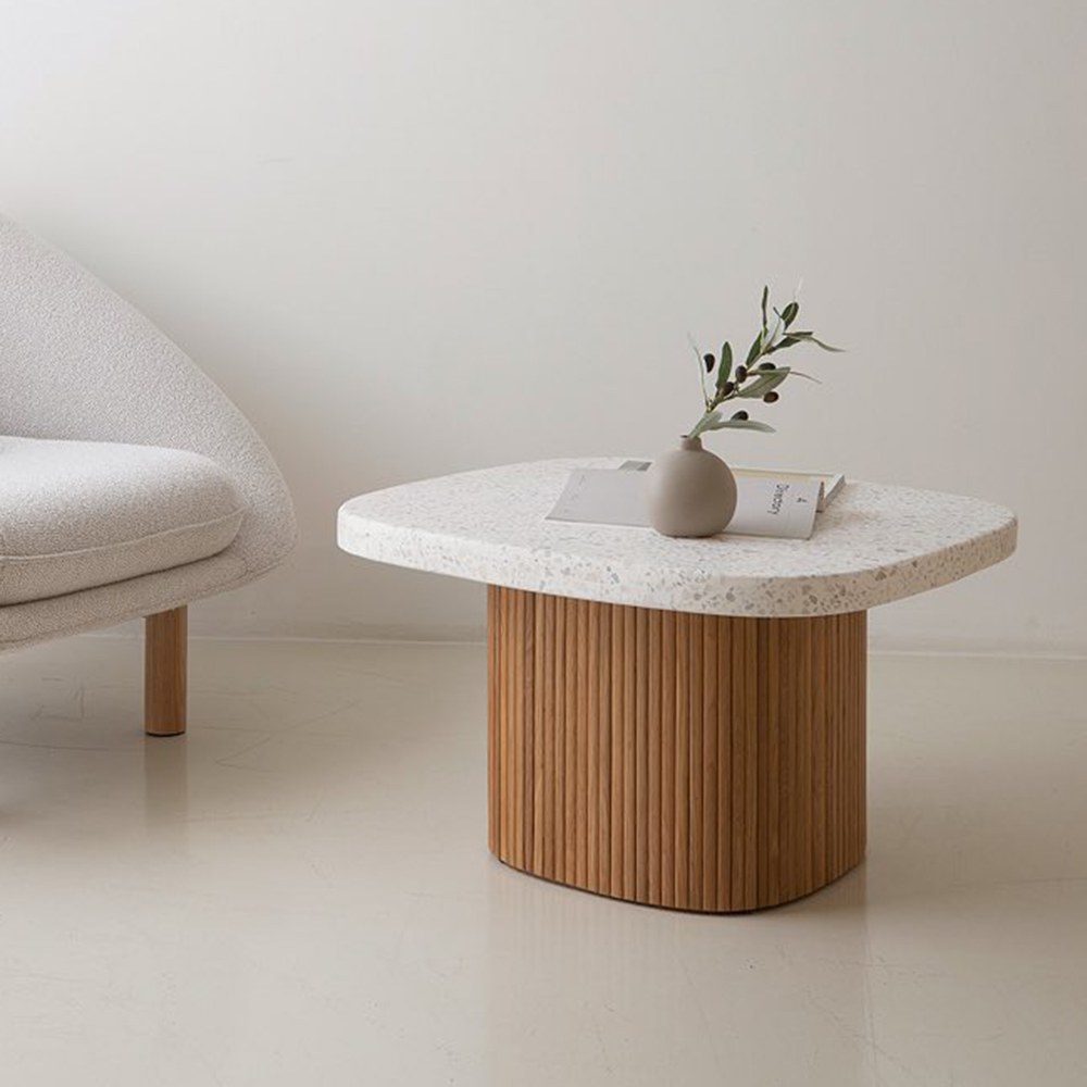 京都詩意水磨石茶几,水磨石桌面讓人瞬間有步入鄉間小徑中的自然溫潤感受,桌腳則是以柵欄式木作圍繞成圓方型,象徵京都式建築的文化,將和風微微沁入你的生活,而同樣為圓方型的水磨石桌面,不僅在居家中很好搭配,也能減去被銳角誤傷的情況。