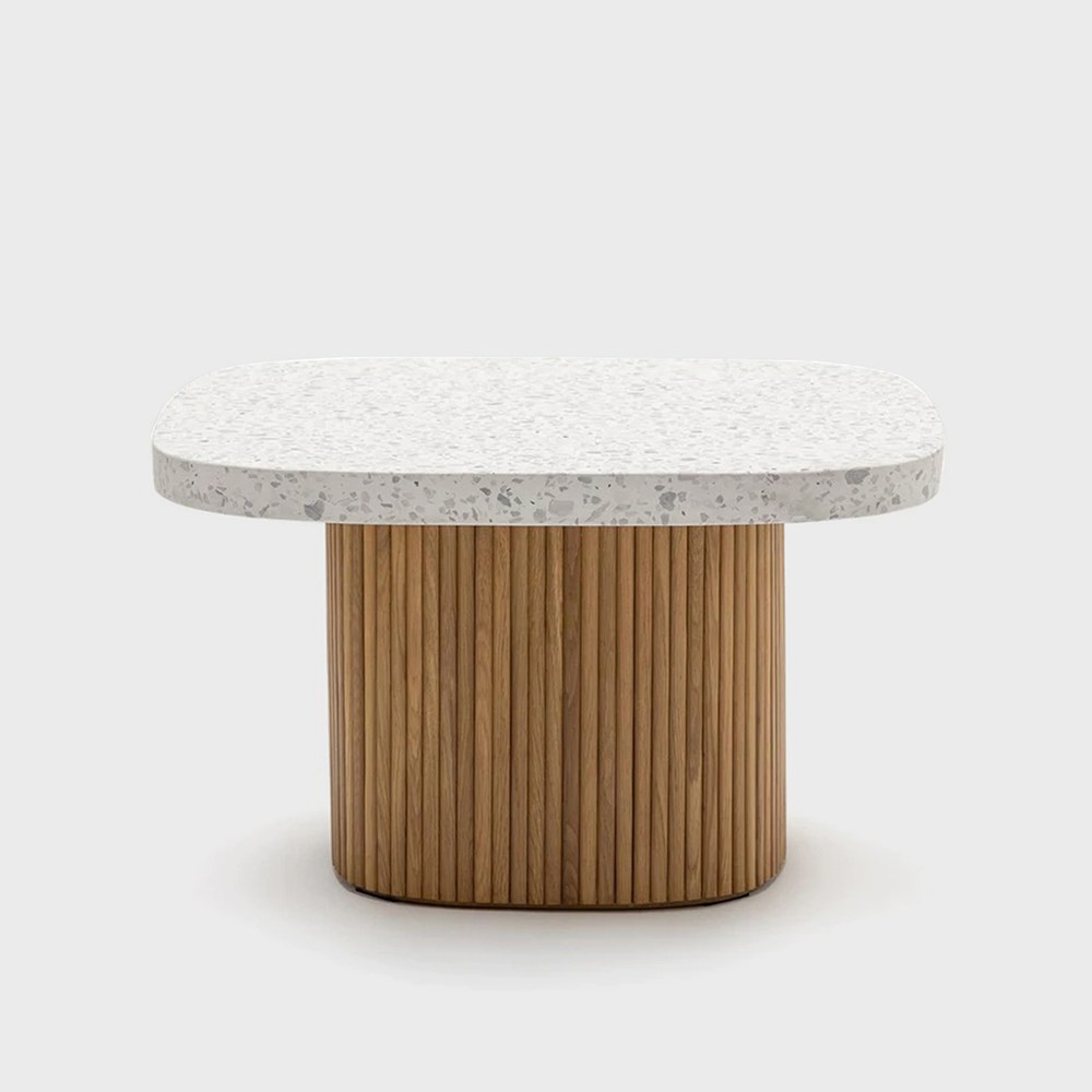 京都詩意水磨石茶几,水磨石桌面讓人瞬間有步入鄉間小徑中的自然溫潤感受,桌腳則是以柵欄式木作圍繞成圓方型,象徵京都式建築的文化,將和風微微沁入你的生活,而同樣為圓方型的水磨石桌面,不僅在居家中很好搭配,也能減去被銳角誤傷的情況。