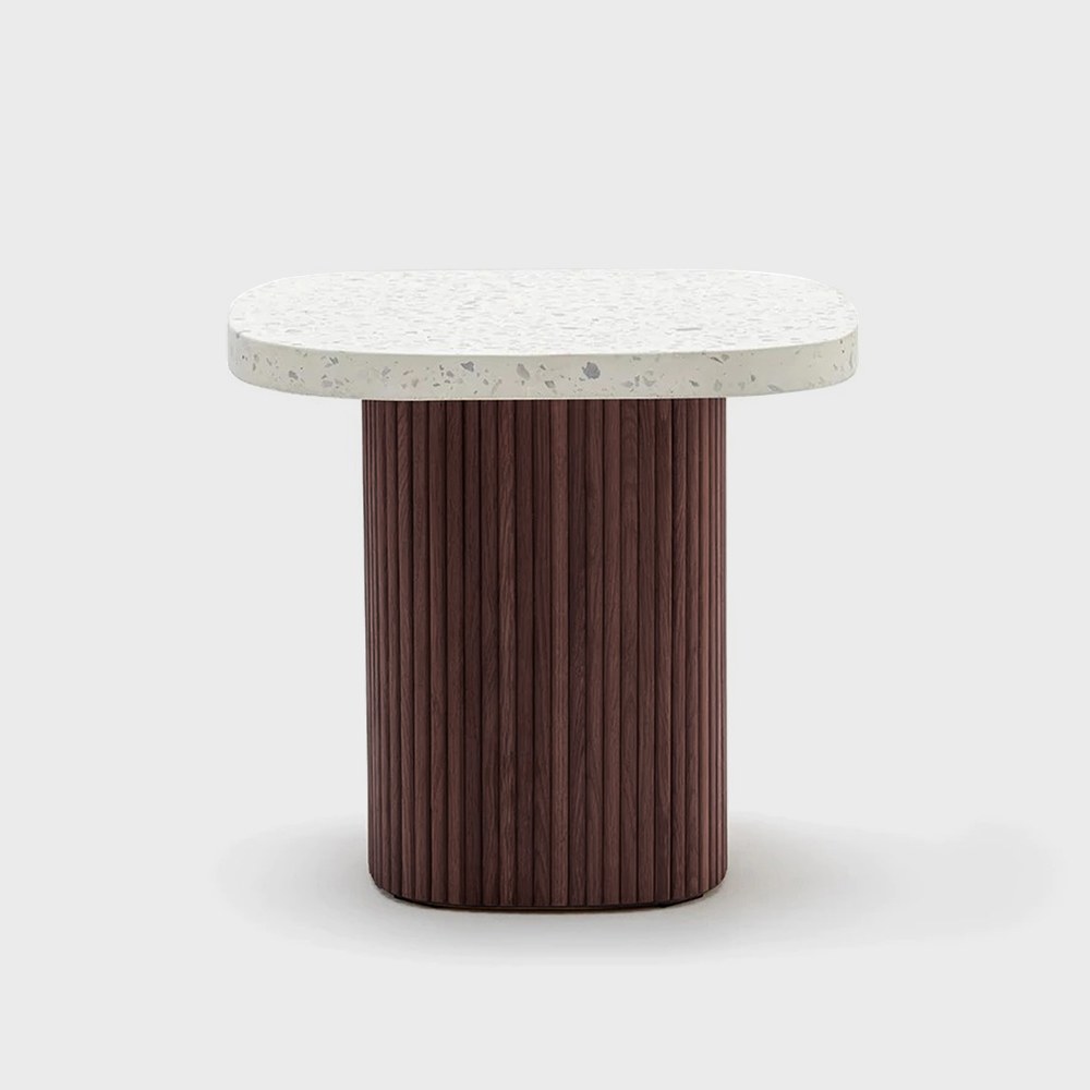 京都詩意水磨石茶几,水磨石桌面讓人瞬間有步入鄉間小徑中的自然溫潤感受,桌腳則是以柵欄式木作圍繞成圓方型,象徵京都式建築的文化,將和風微微沁入你的生活,而同樣為圓方型的水磨石桌面,不僅在居家中很好搭配,也能減去被銳角誤傷的情況。