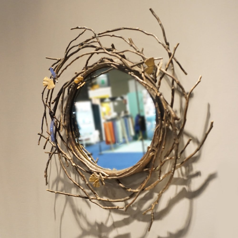銀杏葉有著如蝴蝶翅膀般的模樣,隨風而下便有如蝴蝶飛來的姿態,像是樹木幻化成生物,擁有閃動的雙眼在眨著,對此深深著迷的 Michael Aram 便製作了此系列,精細的描繪銀杏葉的脈絡,更呈現了好似蝴蝶飛舞般靈動的神韻與氛圍,此款銀杏蝴蝶翅膀裝飾圓鏡,精美而夢幻的造型讓人如同生在童話故事中一般,讓鏡子也可以是藝術擺飾,也可以增加空間中的穿透性與靈活度。