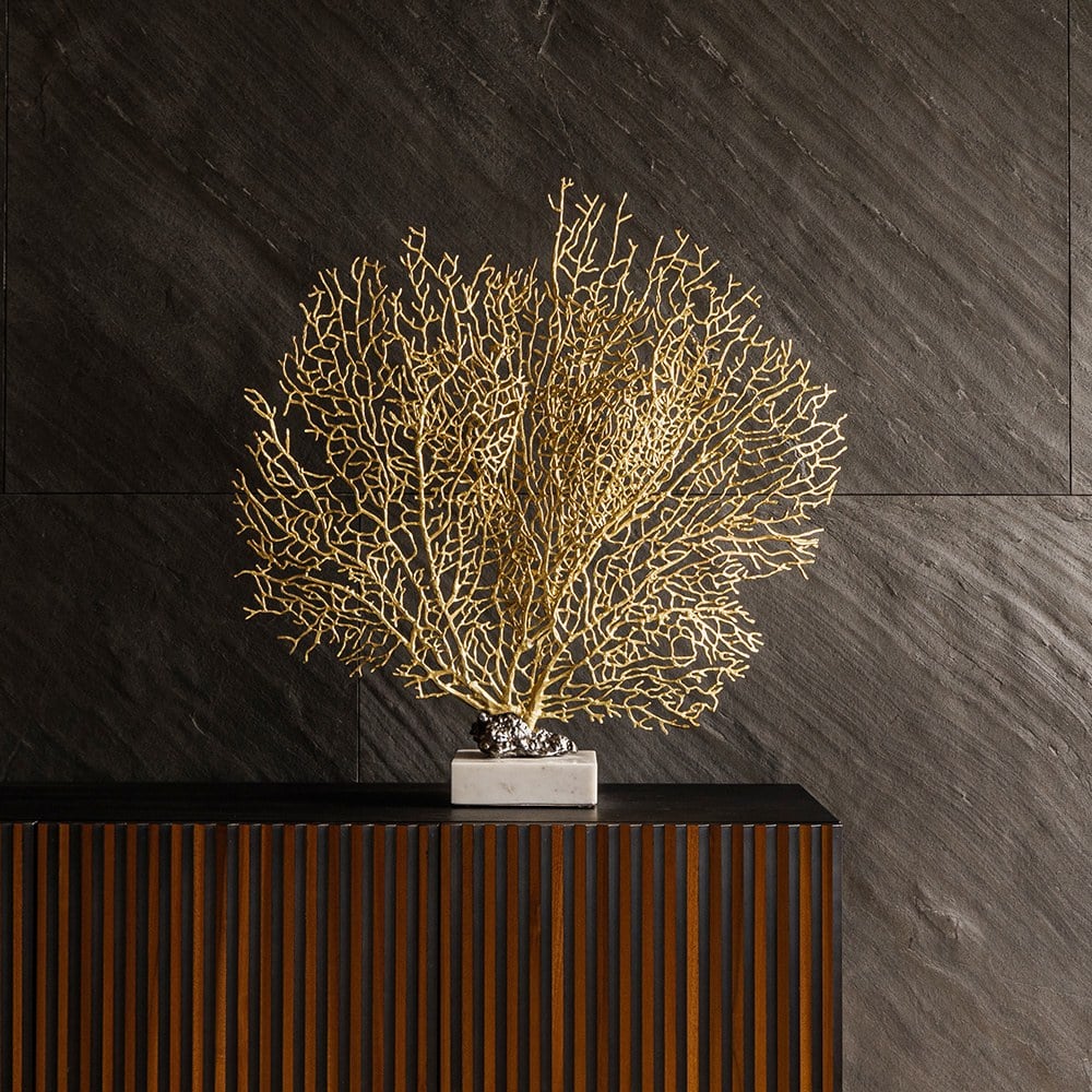 擬真扇狀珊瑚雕塑擺飾,一座碩大的扇珊瑚迎著海水飄楊,由最微小的珊瑚聚集而成,繁複而美麗的水底枝枒應運而生,海洋系列的靈感來自海洋美麗的環境下所生存的各種生物,豐碩而富饒,每一座海底的珊瑚都彷彿是藝術家雕塑而成天然瑰寶。