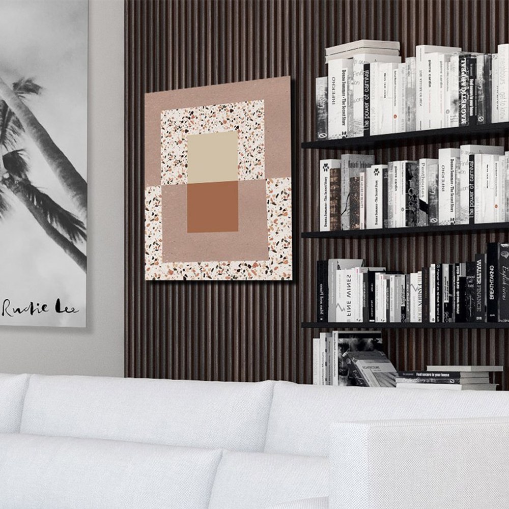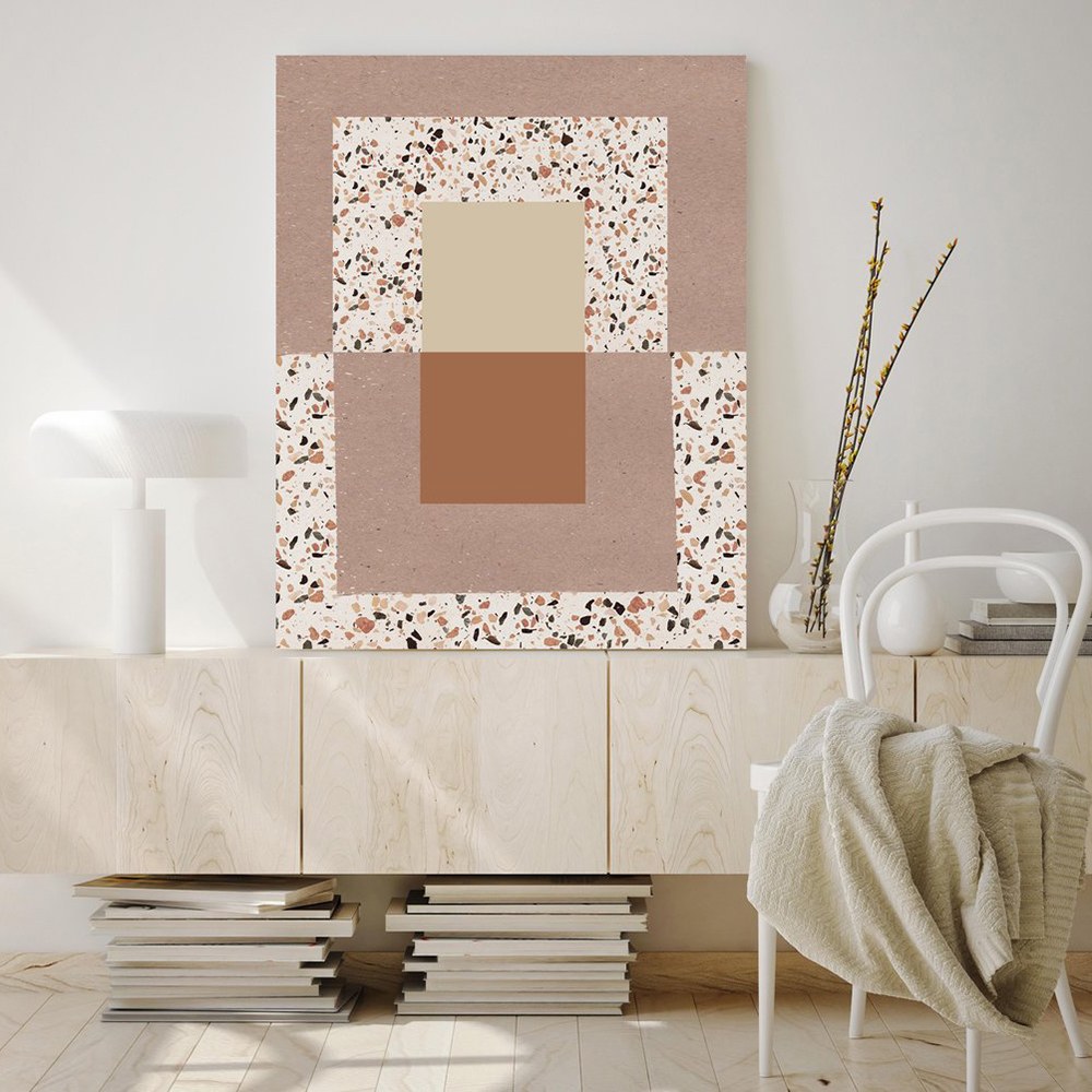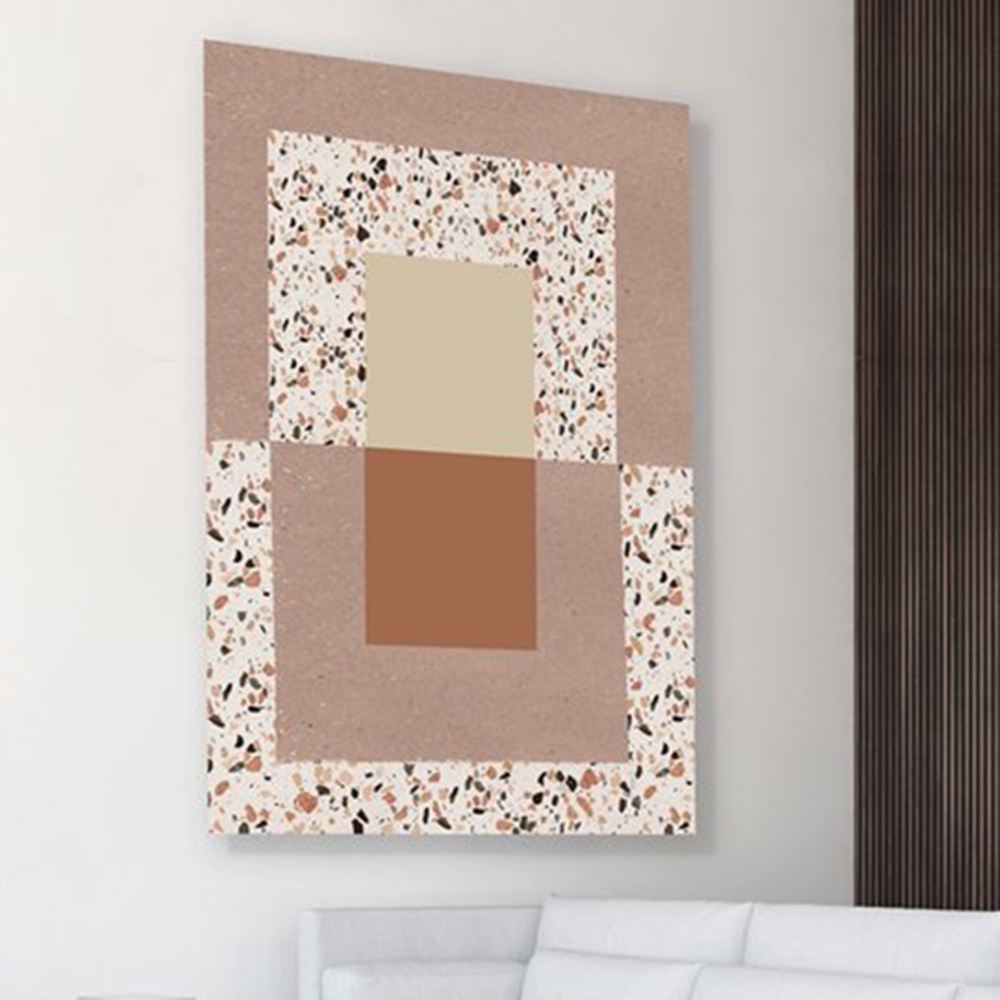 峽谷砂石多格圖紋掛畫以砂土色為底,加入水磨石的圖繪,將峽谷風景裡會接觸到的色彩、元素都表現在其中,藝術家以抽象的圖形拼湊出大自然的地景,讓喜歡抽象畫作也能有親近自然的體驗,適合各種室內空間做擺設與吊掛。