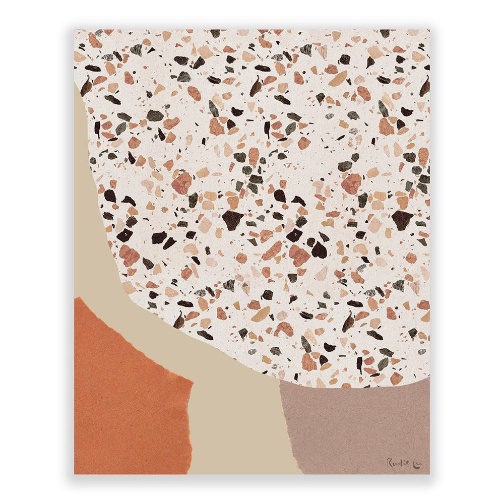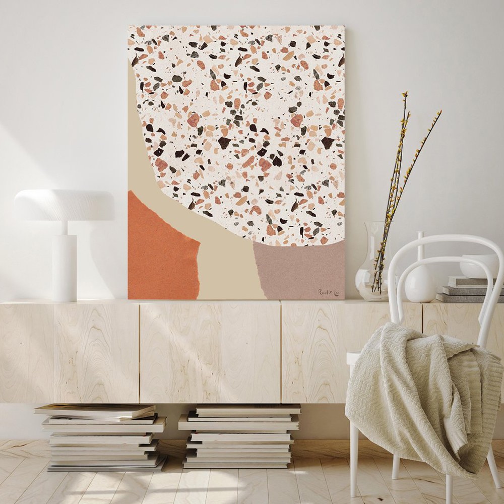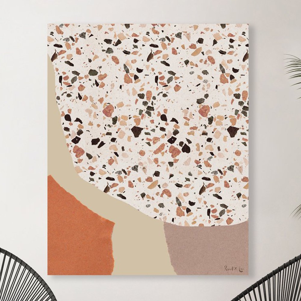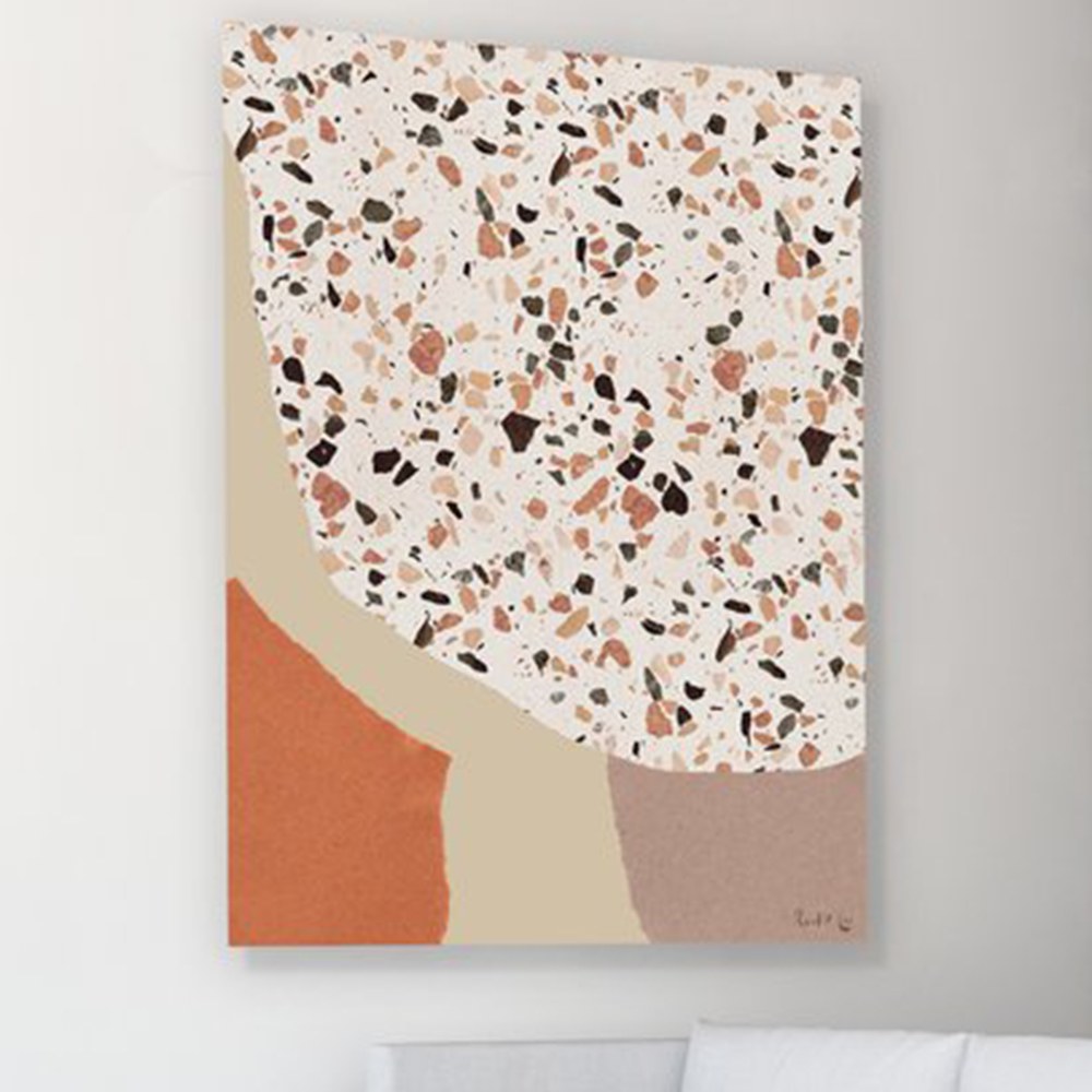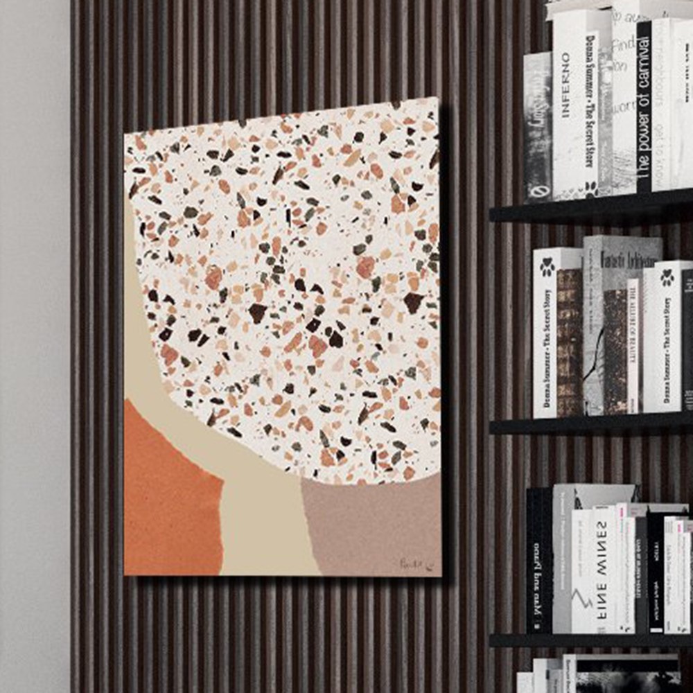 峽谷砂石抽象拼貼掛畫以砂土色為底,加入水磨石的圖繪,將峽谷風景裡會接觸到的色彩、元素都表現在其中,藝術家以抽象的圖形拼湊出大自然的地景,讓喜歡抽象畫作也能有親近自然的體驗,適合各種室內空間做擺設與吊掛。