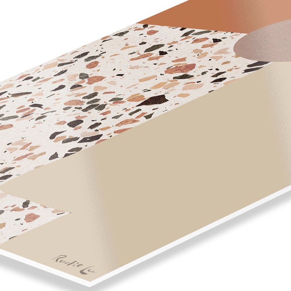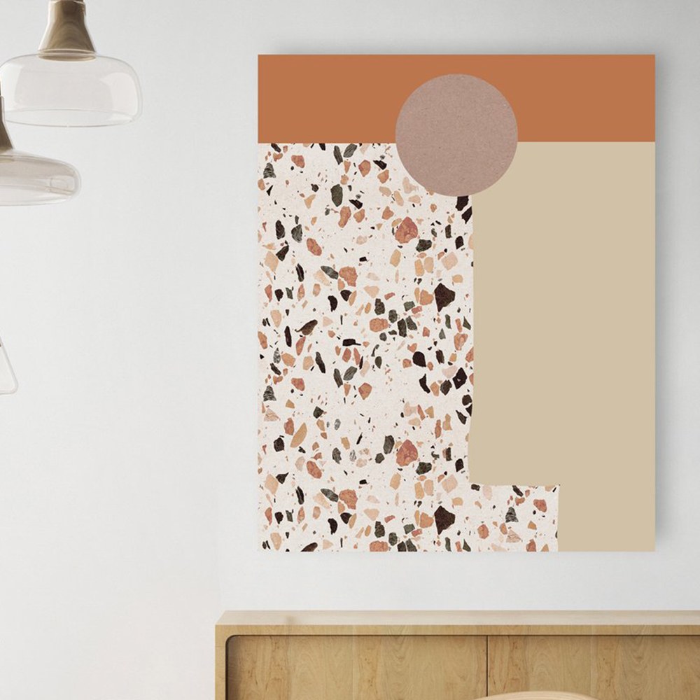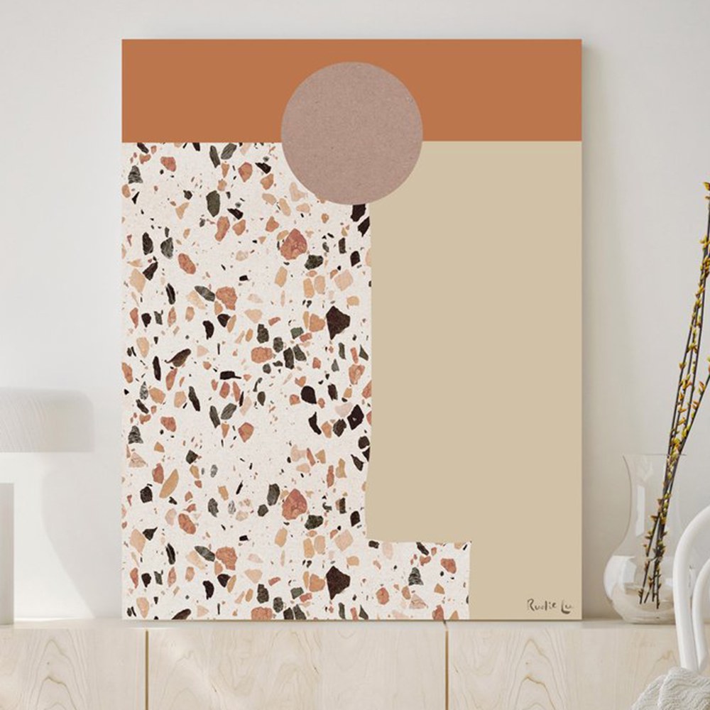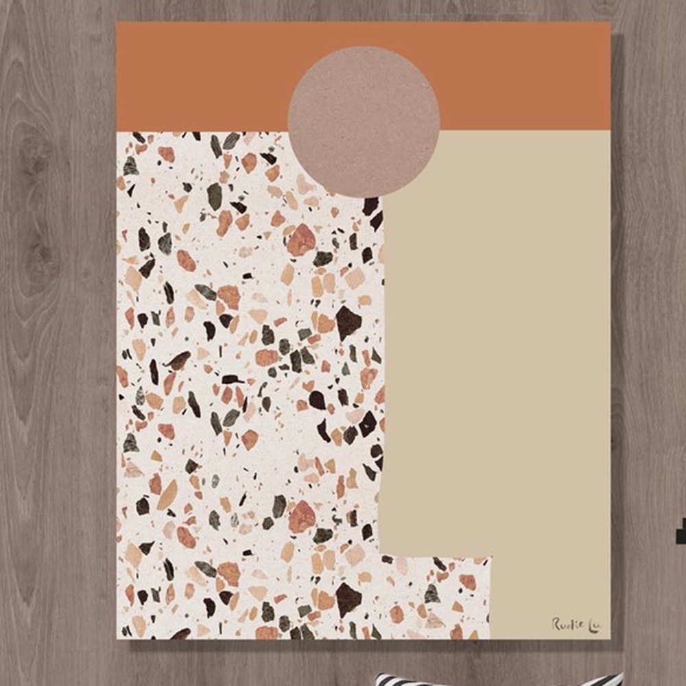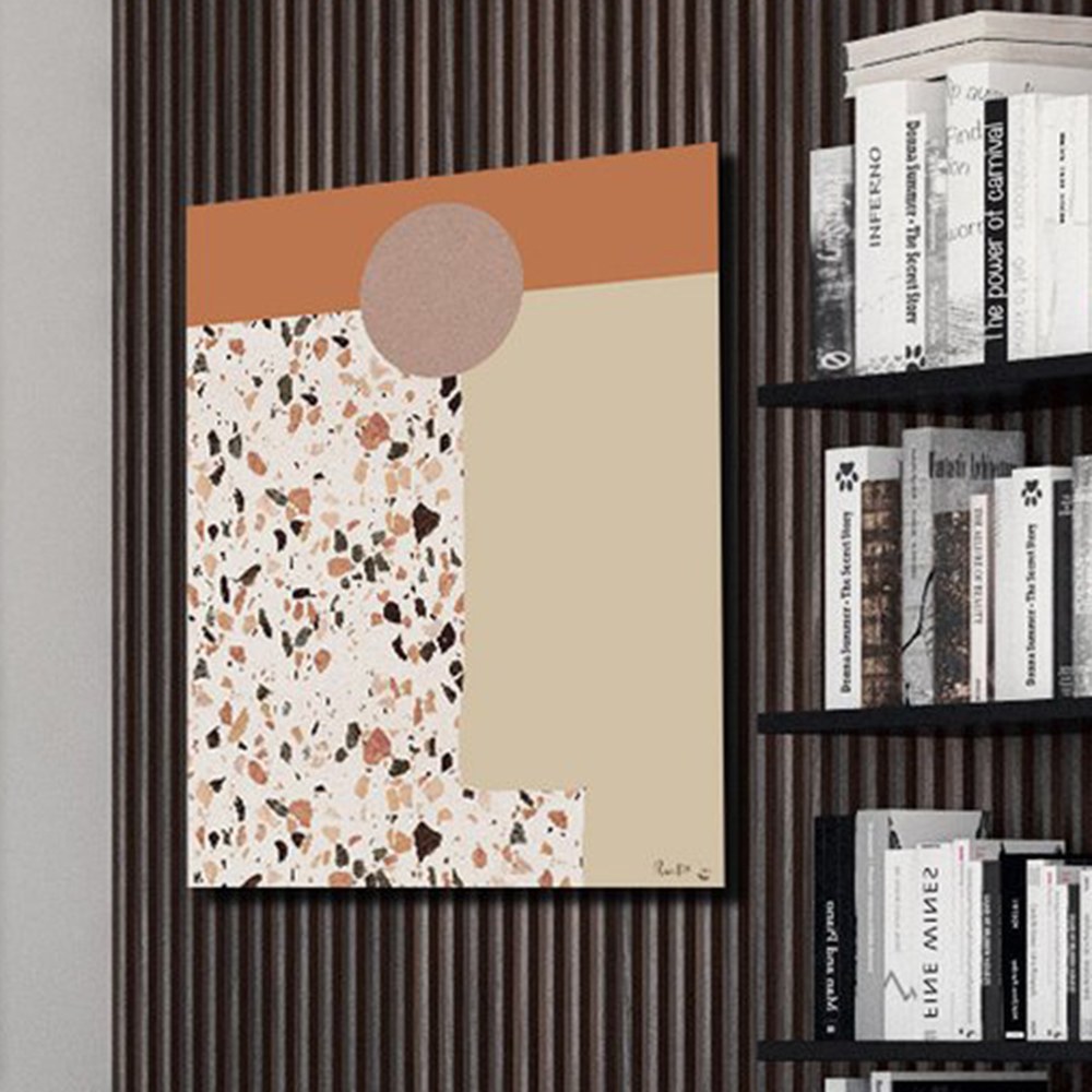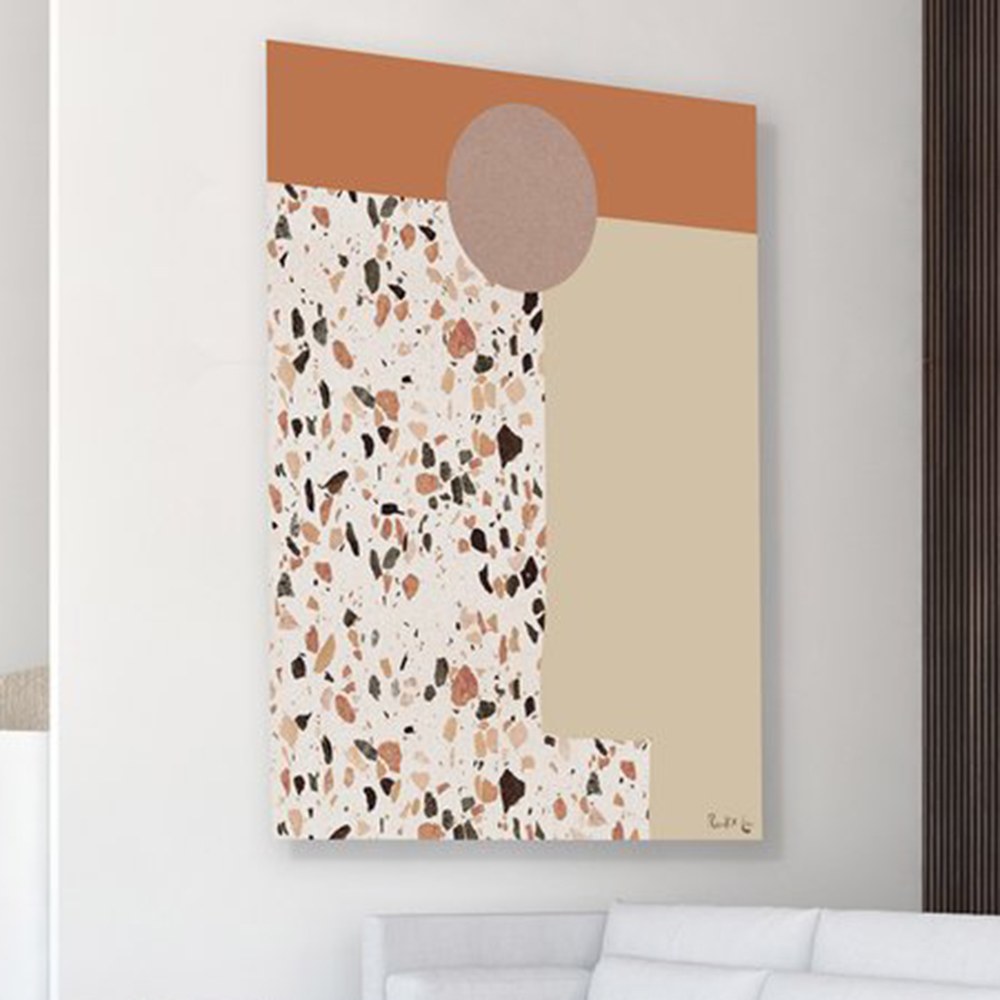峽谷砂石落日掛畫以砂土色為底,加入水磨石的圖繪,將峽谷風景裡會接觸到的色彩、元素都表現在其中,藝術家以抽象的圖形拼湊出大自然的地景,讓喜歡抽象畫作也能有親近自然的體驗,適合各種室內空間做擺設與吊掛。