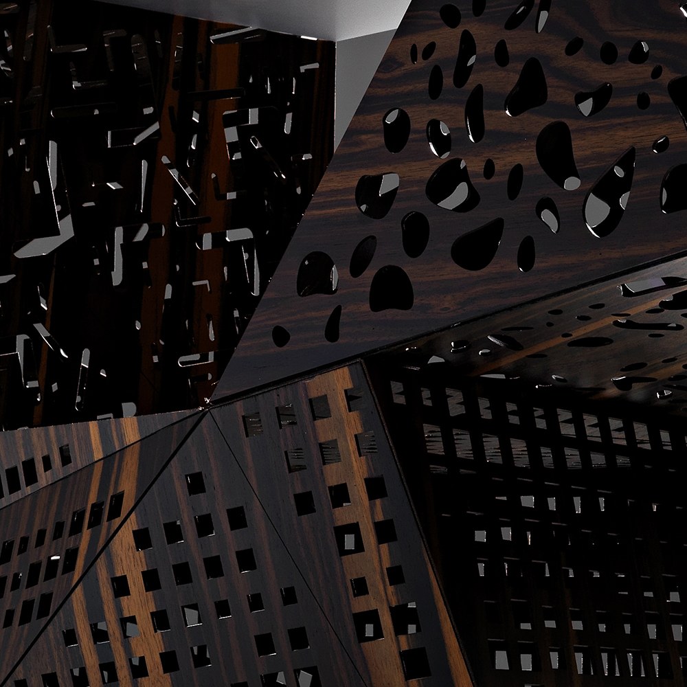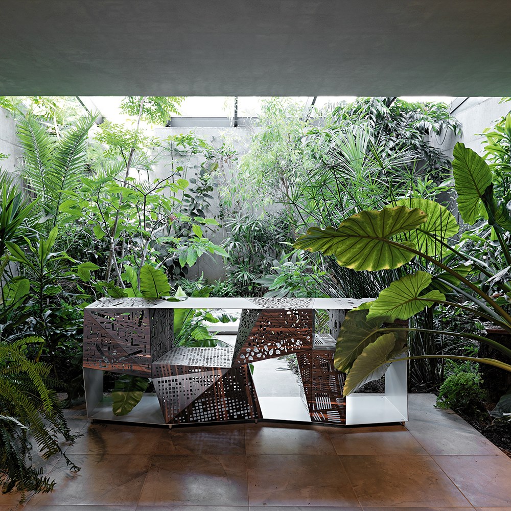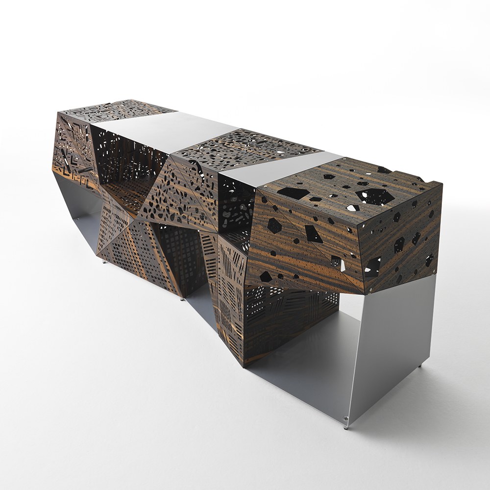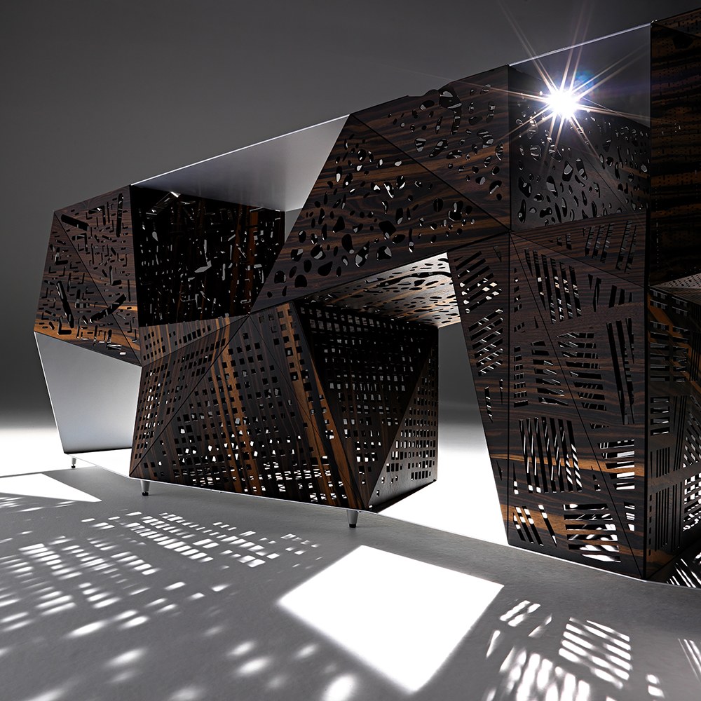 Riddled Buffet 邊櫃以黑檀木拼接鋁材,櫃體上有許多經由鐳射雕刻出的孔洞,採用摺紙式的表現方法,去建構櫃子裡的每一個空間,可以展示各種收藏品與物件,亦可將它作為一件藝術品來觀賞。