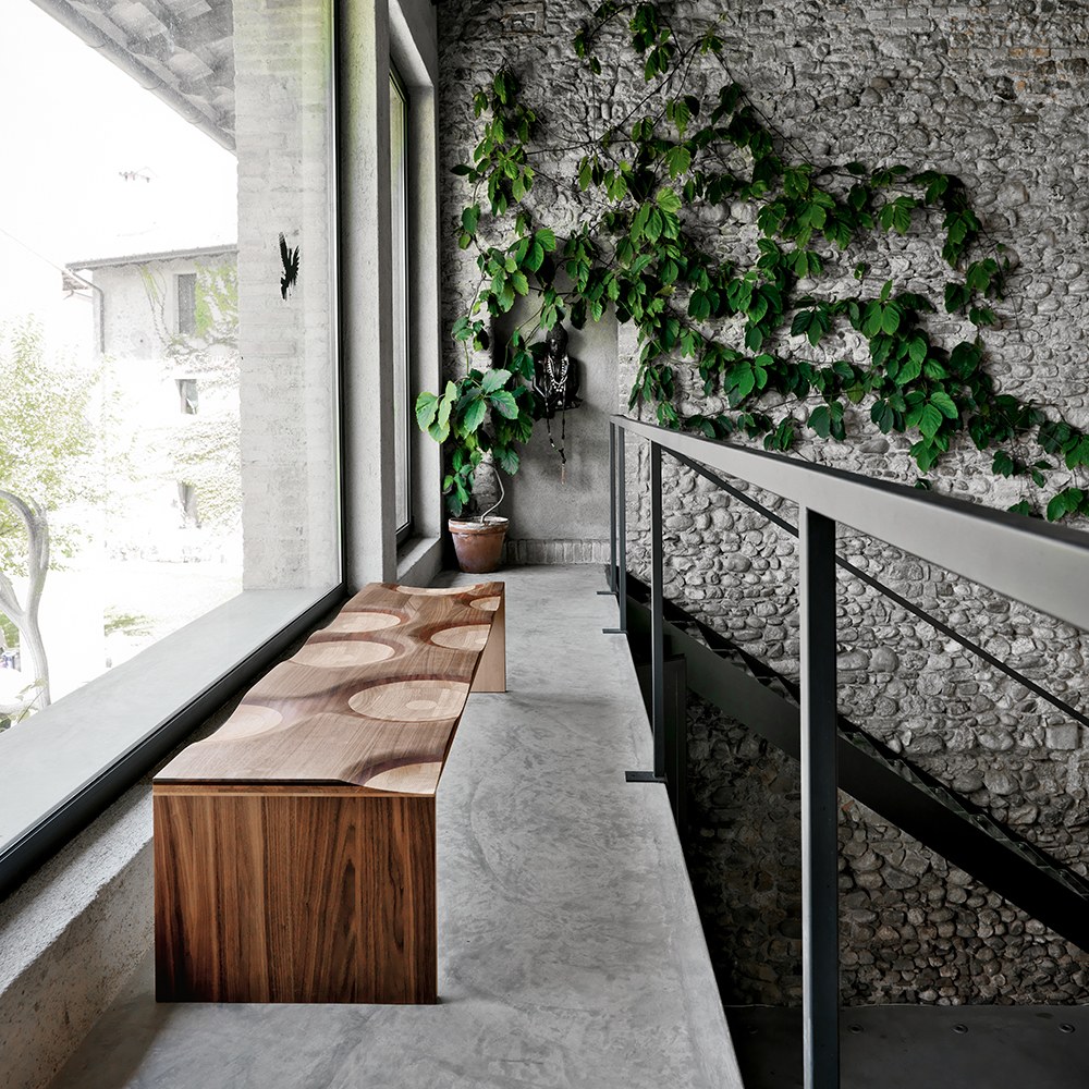 由原木層層疊疊後,巧妙的利用二方連續的設計,讓這款長凳可以任意拼接延伸,提供生活不可或缺精緻而細膩的風格設計,結合藝術,美學與義大利設計的良好功能性所創造獨一無二的獨特氛圍。