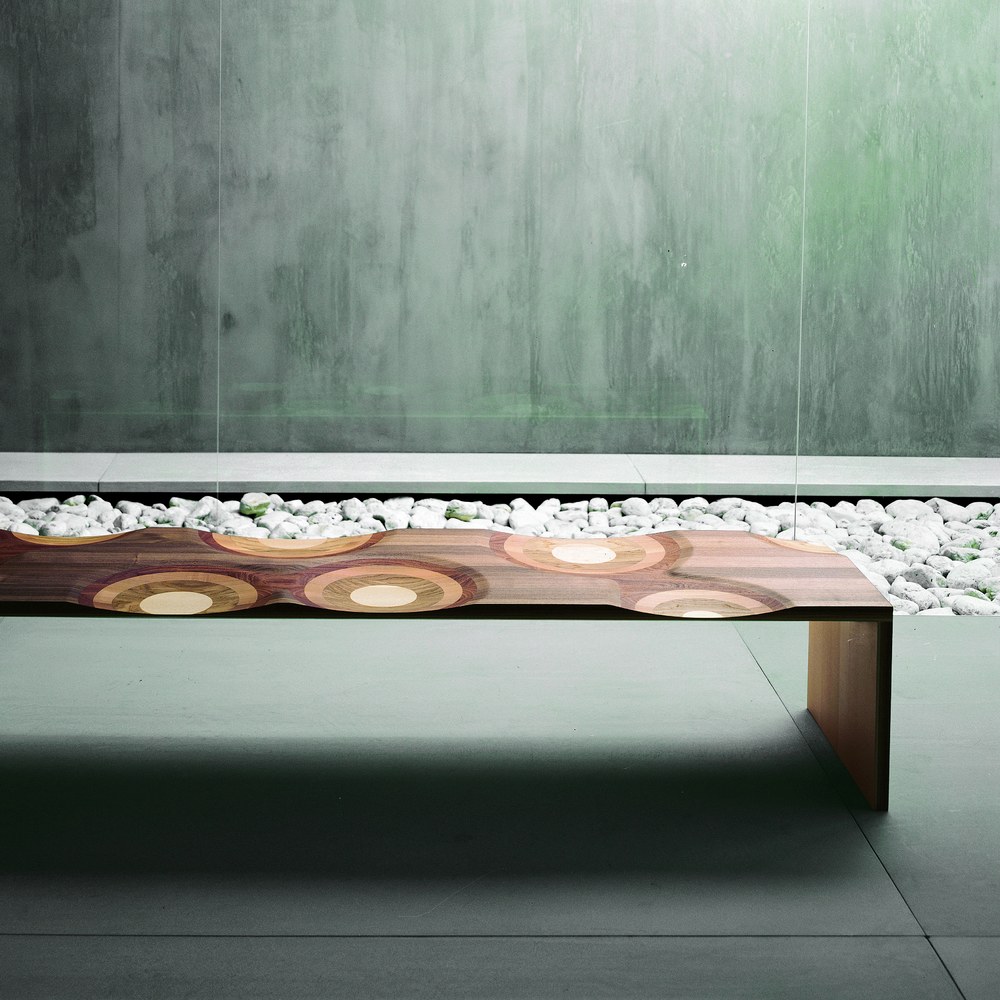 略帶彎曲的椅面上有著宛若朝露滴落在小河流所泛起的陣陣漣漪,一圈又一圈,這一款長凳由日本著名建築師-伊東豊雄與義大利Horm.it聯合設計製作。秉持著『人、建築都需要與自然環境建立一種連續性的關係,不僅是節能的,還是生態的、能與社會跟環境所互相協調』概念所創作。
