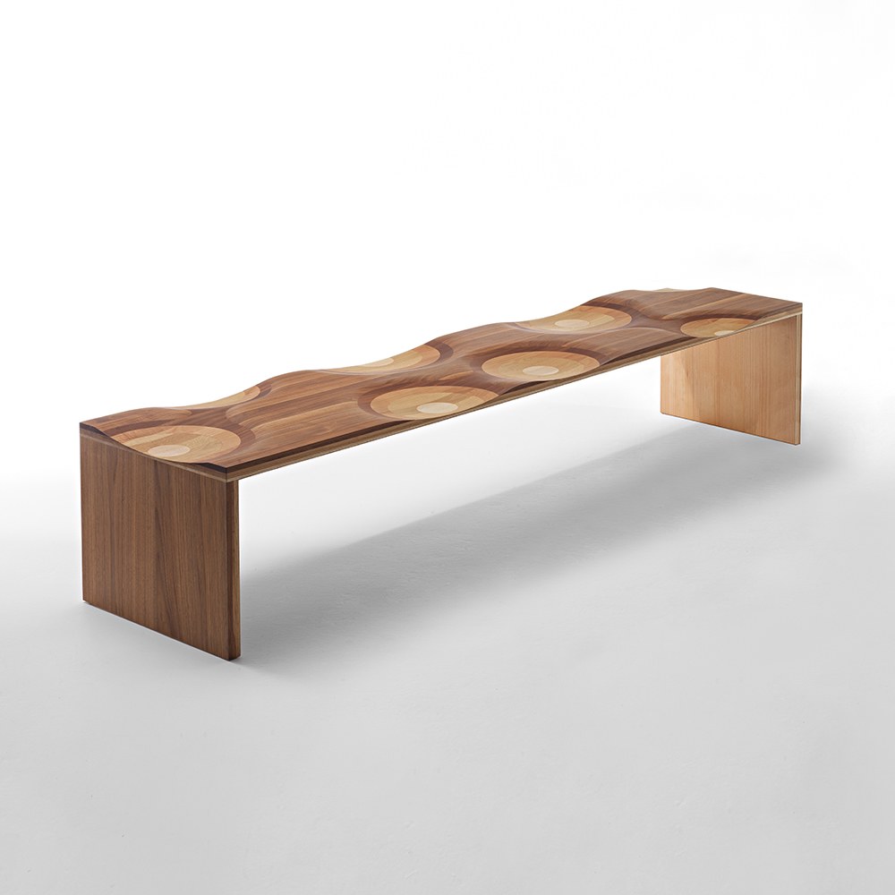 Ripples造型漣漪長凳以5種的木材來設計,經由細膩的木作技巧鑿出椅面上一圈圈的凹面,不同色澤與紋路的木材便在這些凹面處展現出了獨特的畫面,就像是葉片飄落在水面時所泛起的陣陣漣漪。