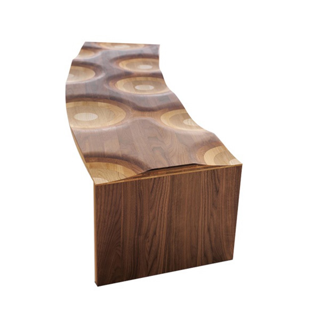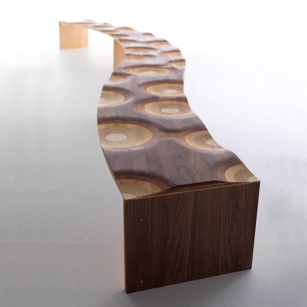 Ripples造型漣漪長凳以5種的木材來設計,經由細膩的木作技巧鑿出椅面上一圈圈的凹面,不同色澤與紋路的木材便在這些凹面處展現出了獨特的畫面,就像是葉片飄落在水面時所泛起的陣陣漣漪。