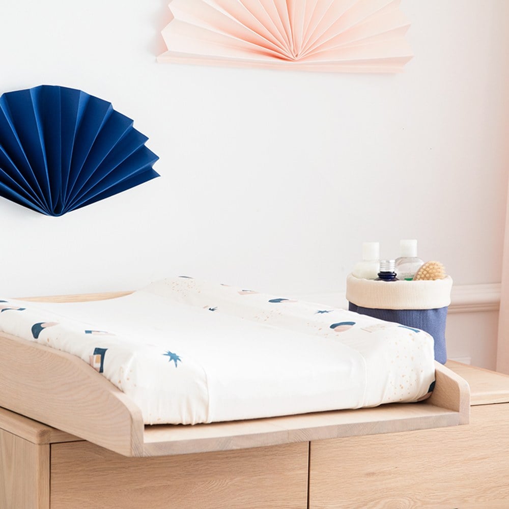 西班牙Nobodinoz的尿布更換台可與系列的尿布更換墊搭配使用,在上面擺放柔軟防水的更換墊子,尿布墊中間內凹的形狀能將寶寶放置於此固定,兩邊隆起的設計讓剛學會翻身的新生兒無法輕易亂動,內部防水材質讓清潔非常容易,只須清洗外面的布套即可重複使用。