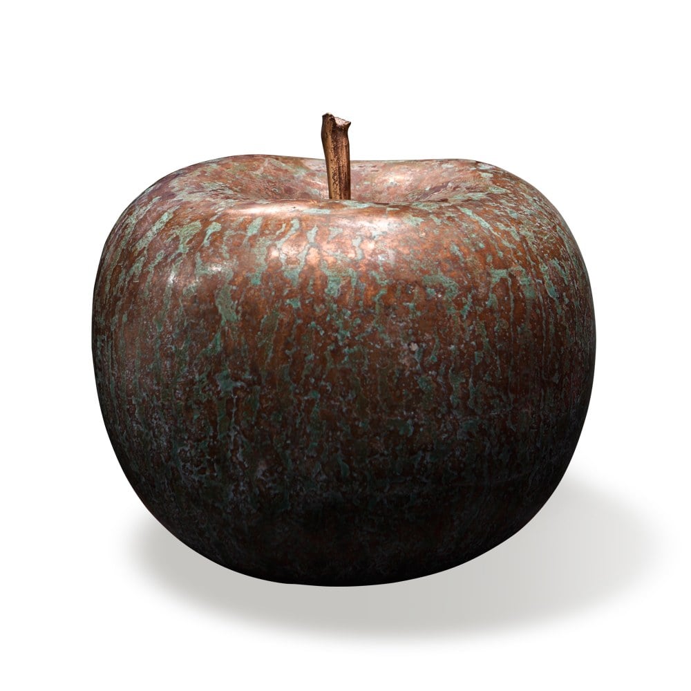 青銅圖佈的表面映著低調的光澤,以獨特的錫銅材質鑄成生命永恆的蘋果型青銅雕塑。這款蘋果雕塑源自於日常常見的水果,它渾圓可愛的外型總是帶了點童趣的夢幻感,加上超現實的大小,很像愛麗絲夢遊仙境裡的場景,掉入地底的愛麗絲,一下子比樹還高,一下子在午茶杯裡游泳,困惑的一口一口咬著蘑菇來調整自己身體的大小。這個碩大的青銅大蘋果,作為庭園裝飾好像也有一點迷幻的效果,讓比例尺好像失去原本的刻度,讓人也想在莊園裡來一場探險的夢境。